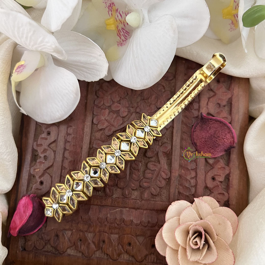 Enhance your hairdo with the luxurious Vriksham Golden Floral Kundan Hair Clip. Featuring intricate floral designs and premium Kundan stones, this clip adds a touch of elegance and sophistication to any look. Add a touch of luxury to your everyday style with this exquisite hair accessory.