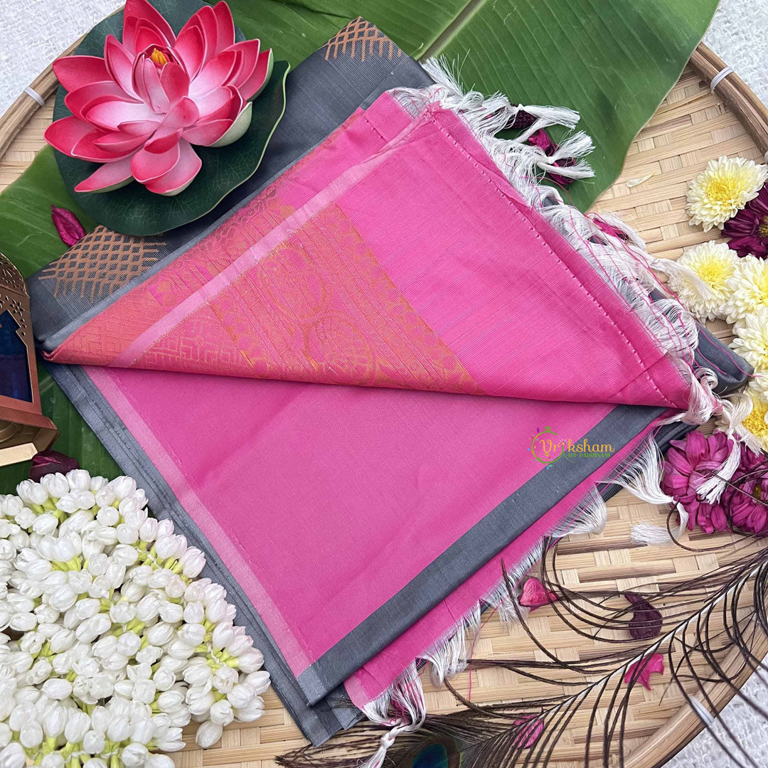Discover understated elegance with this refined semi-soft silk saree in sophisticated grey, adorned with a meticulously crafted squared pattern that embodies contemporary aesthetics. The soft pink Gadwal border introduces a delicate contrast, celebrating traditional weaving excellence and authentic cultural artistry. Crafted for the discerning wearer, this saree effortlessly complements formal occasions and curated everyday moments with equal poise. The premium semi-soft silk fabric delivers a graceful drape with exceptional durability, ensuring sustained beauty and comfort through extended wear. A timeless investment that harmoniously blends heritage craftsmanship with modern sensibilities, offering versatile sophistication for the refined wardrobe.