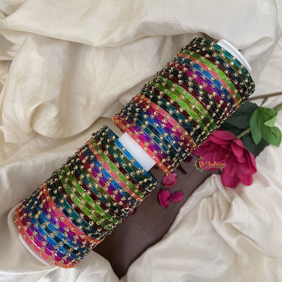 Celebrate the joyous moments of Seemantham and baby showers with the Vriksham Golden Heart Bangles set. Crafted to adorn both hands, this elegant collection features delicately designed golden heart motifs that symbolize love and blessings. Perfectly blending tradition with refined style, these bangles add a graceful touch to your special occasion attire.