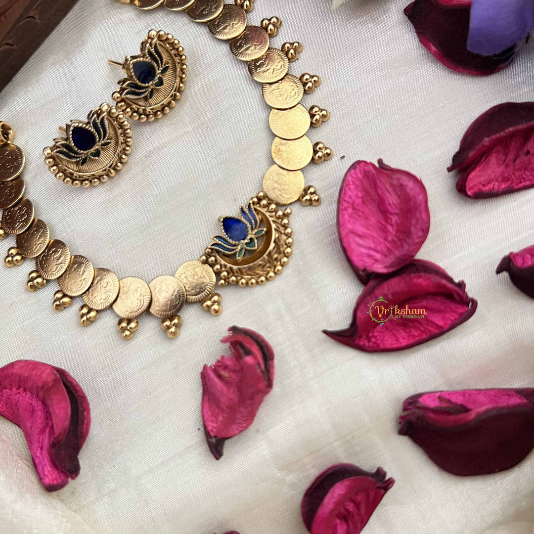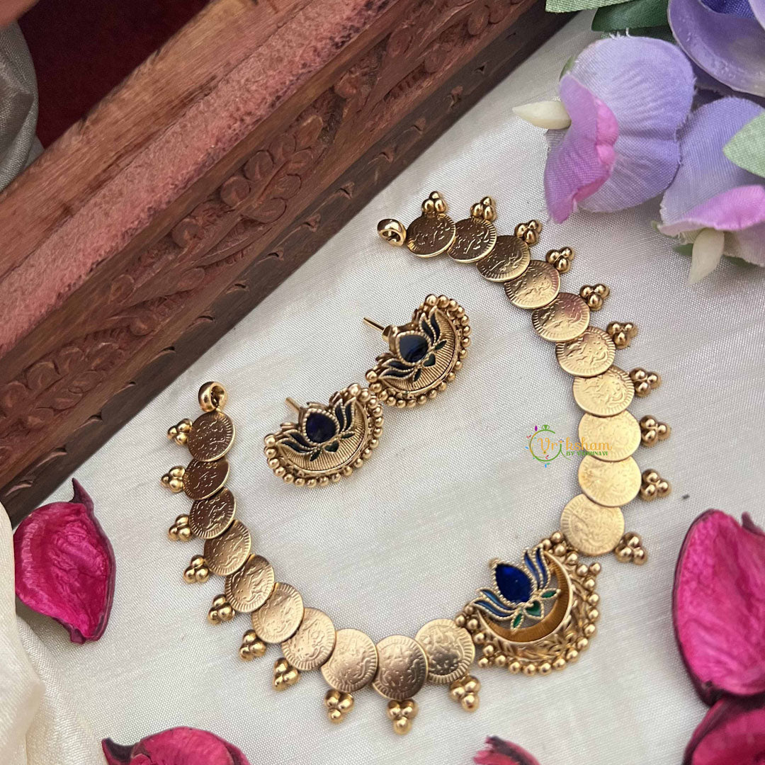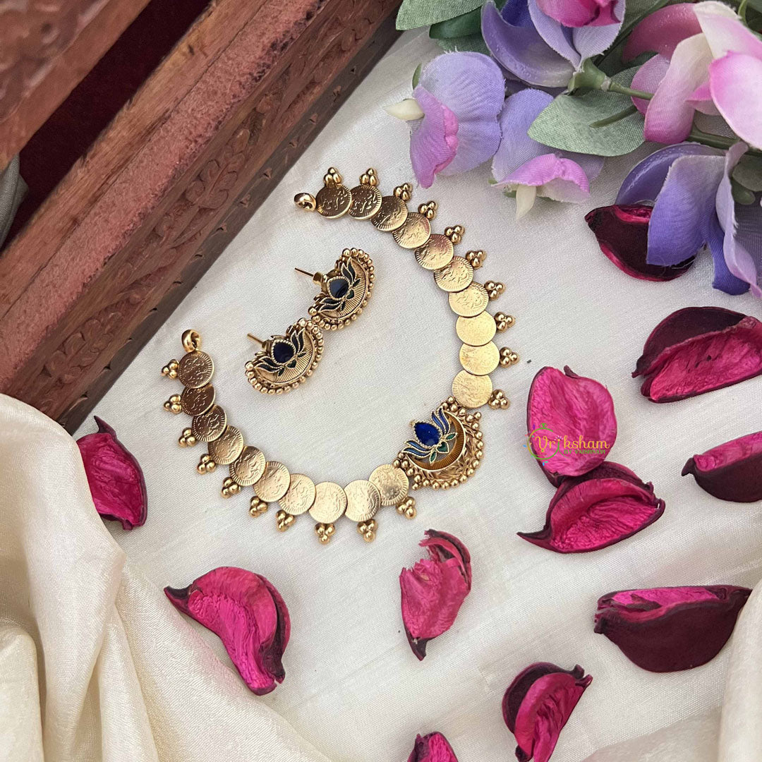 Elevate your elegance with this stunning neckpiece featuring a golden Lakshmi coin framed by a delicate lotus design. Enhanced with striking blue and green stones, it beautifully combines traditional artistry with modern sophistication. Ideal for special occasions, this piece radiates timeless charm while symbolizing wealth and prosperity.