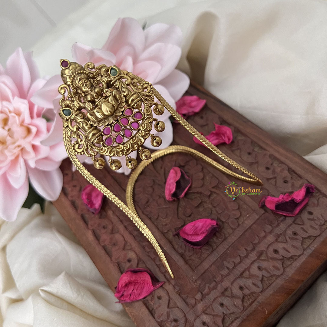 Elevate your look with our Vriksham Golden Lakshmi Vangi, adorned with red and green stones and embellished with golden beads. This armlet exudes elegance and luxury, making it a perfect accessory for any special occasion. Embrace the beauty of traditional Indian jewellery with a modern twist.
