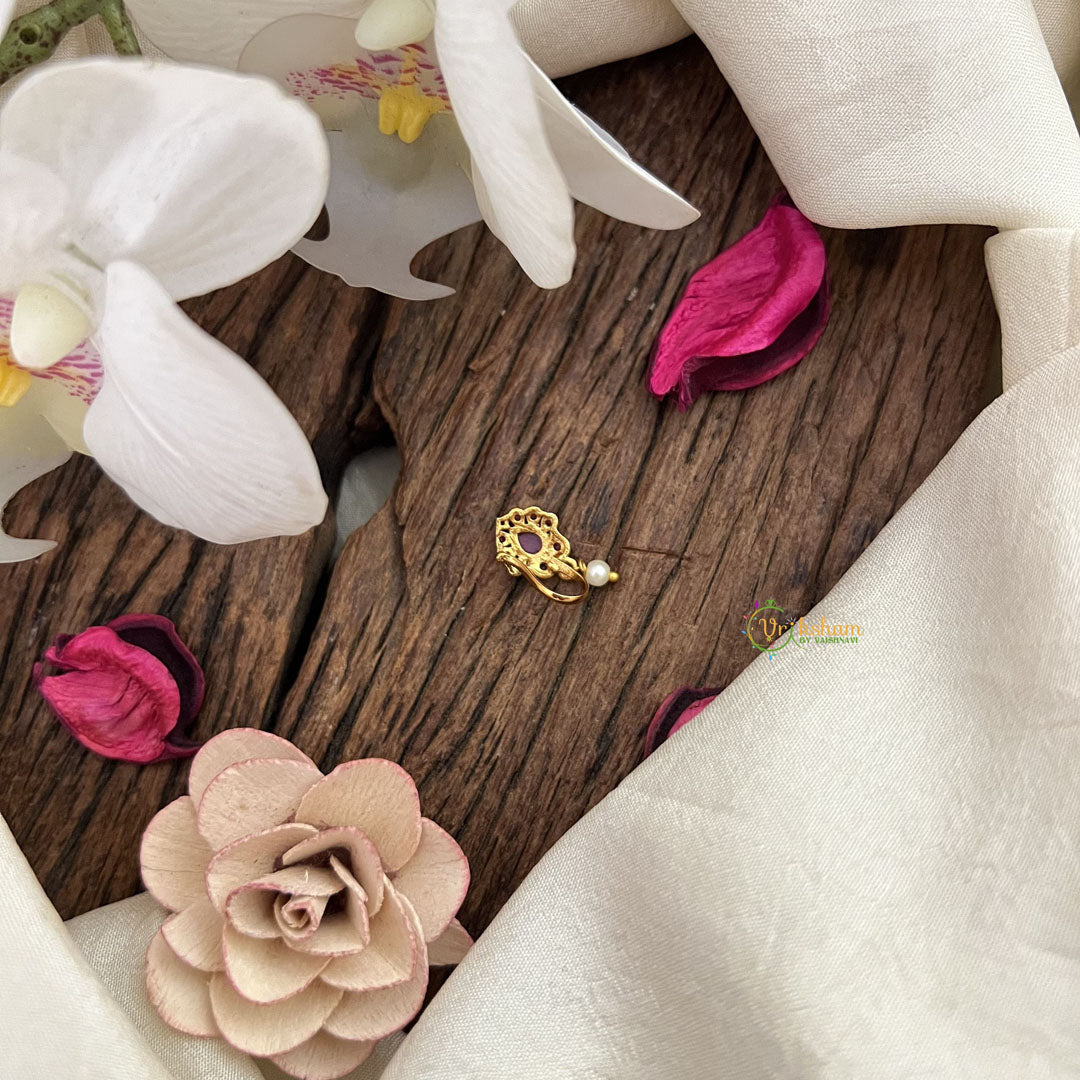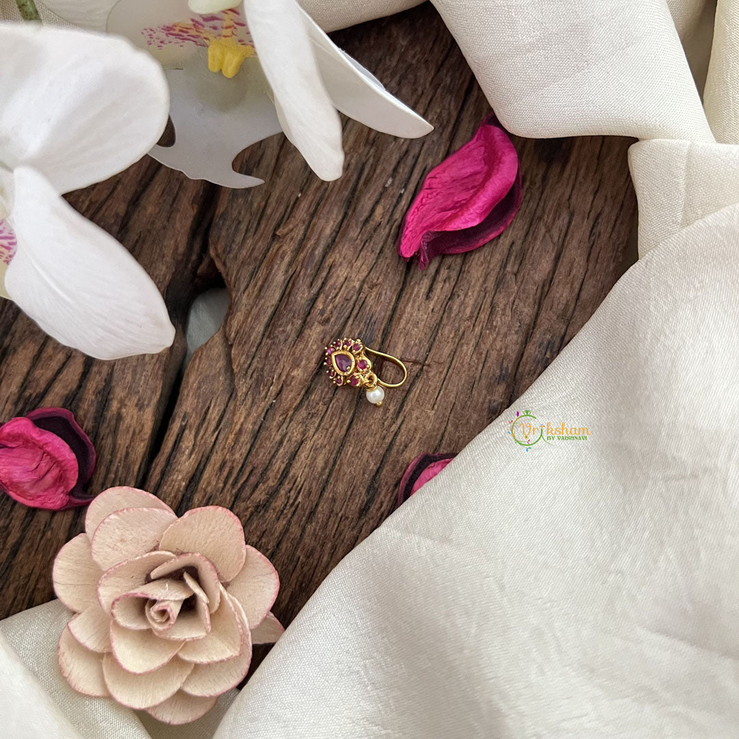 The Vriksham Golden Tear Drop Naths features a striking red accent paired with a delicate pearl, set in a refined golden design. This elegant nose pin offers a perfect balance of traditional charm and sophisticated style, ideal for adding a graceful touch to your special occasion attire.