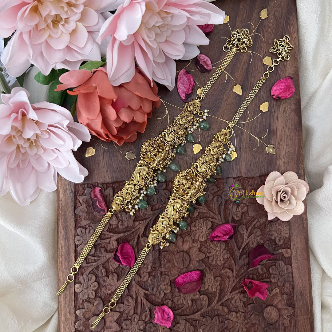 Indulge in luxury and grace with the Vriksham Golden Peacock Strips Laxmi Vangi. This exquisite armlet features delicate pearls and a light green bead, embellished with a golden peacock motif. Designed to enhance your unique beauty, this piece exudes elegance and sophistication. Elevate your style with Vriksham.