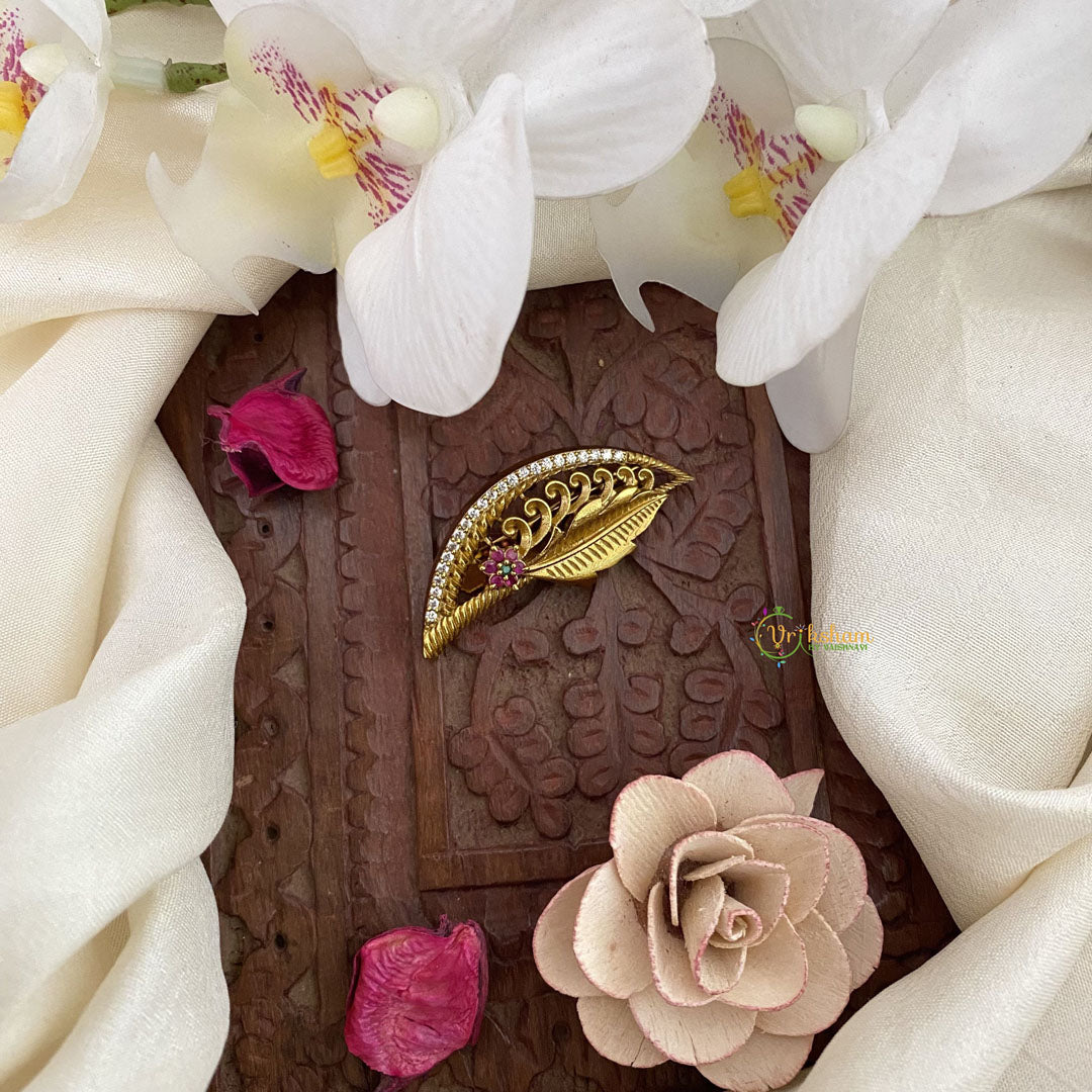 Add a touch of elegance to your saree with our Vriksham Golden Polish AD Stone Saree Pin-Flower Leaf. The intricate design, adorned with sparkling AD stones, will elevate your look and make you stand out. A perfect accessory for any occasion, this pin adds a touch of luxury to your ensemble.