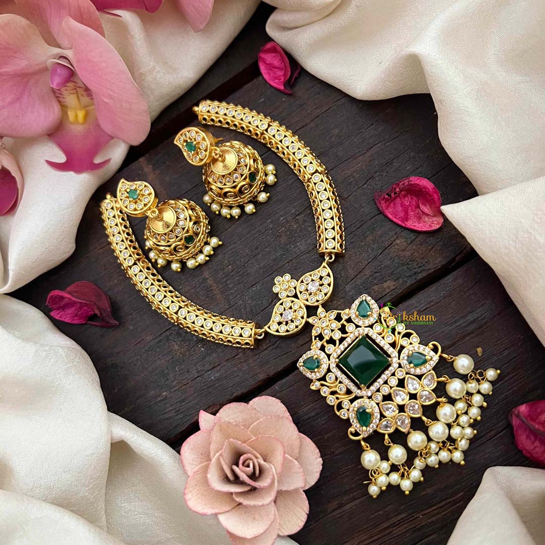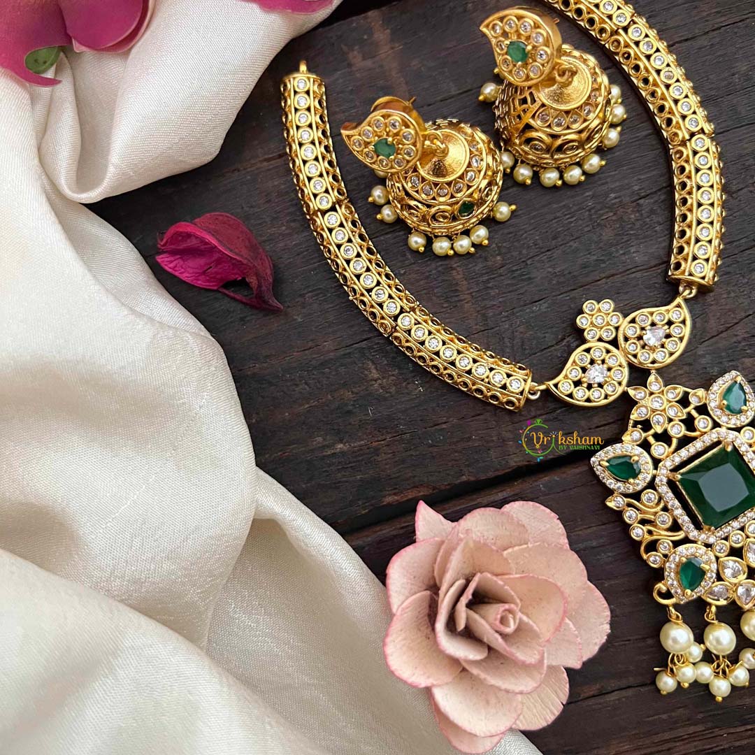 Add a touch of elegance to your ensemble with the Vriksham Gold Look Alike Floral Addigai Neckpiece. Featuring a beautiful floral design in a mix of red and green, this short neckpiece adds a pop of color to any outfit. Made from high-quality materials, it exudes luxury and sophistication.
