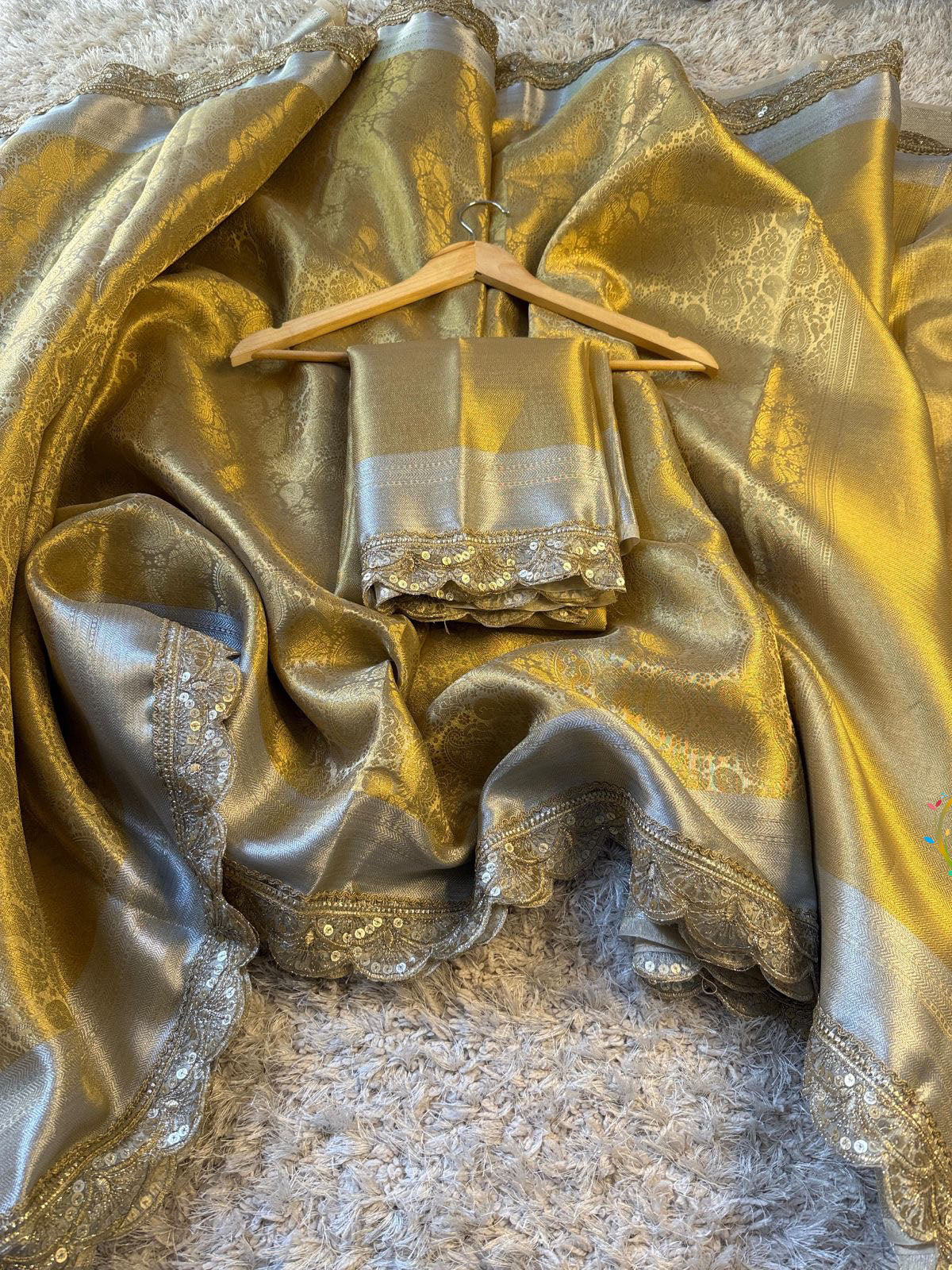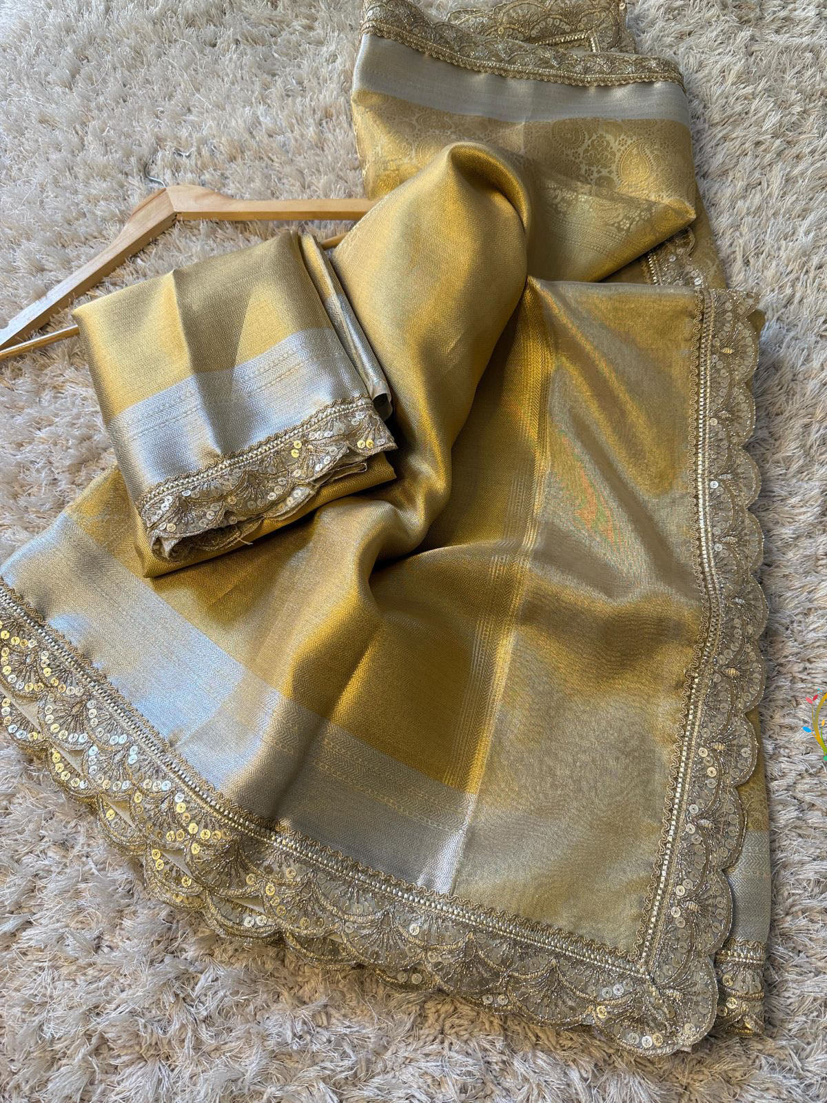 Immerse yourself in the sublime opulence of this Golden Tanchoi Tissue Saree, where timeless elegance meets masterful artisanship. The resplendent golden hue radiates a warm luminosity that captures and reflects light with ethereal grace. Intricate tanchoi weaving patterns cascade across the diaphanous tissue foundation, creating a dimensional tapestry of exceptional refinement. An investment piece that transcends fleeting trends, offering discerning connoisseurs a distinguished expression of heritage craftsmanship and understated luxury.