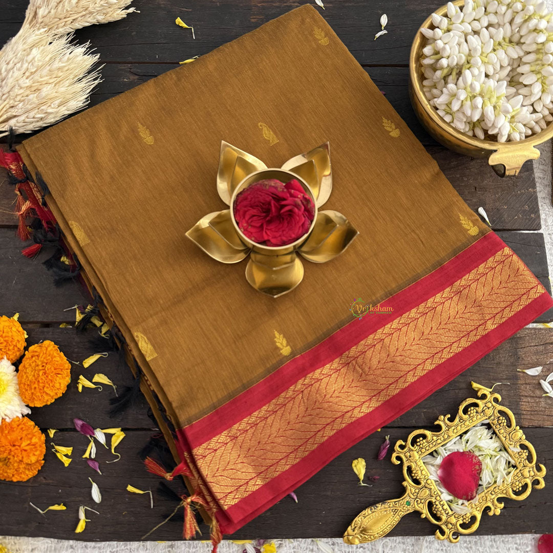 The Vriksham Golden With Red Border-Kalyani Cotton Saree combines traditional elegance with modern sophistication. Made from soft Kalyani cotton, it ensures comfort throughout the day. The subtle golden hues beautifully complement the vibrant red border, creating a striking contrast that enhances your presence at any event. This saree is an exquisite choice for those who appreciate timeless style and quality craftsmanship.