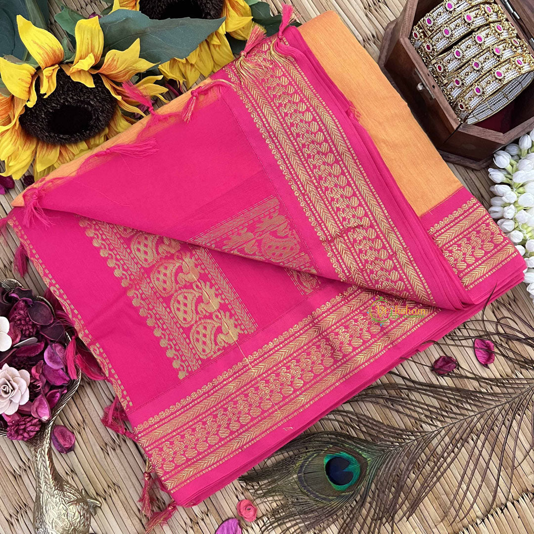 Radiate warmth and grace with this captivating Kalyani cotton saree, blending a luminous golden yellow base with a soft pink border and intricate butta detailing. Woven from premium Kalyani cotton, the fabric offers exceptional breathability and comfort, perfect for all-day elegance and warm weather wear. The harmonious fusion of sunny golden tones and delicate pink creates a cheerful yet refined aesthetic, ideal for festive celebrations, weddings, and special occasions. The ornamental butta design showcases authentic Indian weaving heritage and adds textural sophistication to the composition. Natural Kalyani cotton guarantees superior drape, durability, and effortless care. This versatile piece appeals to the contemporary woman seeking joyful sophistication—combining cultural craftsmanship with modern sensibilities, practical comfort, and timeless appeal that transitions seamlessly across various occasions.