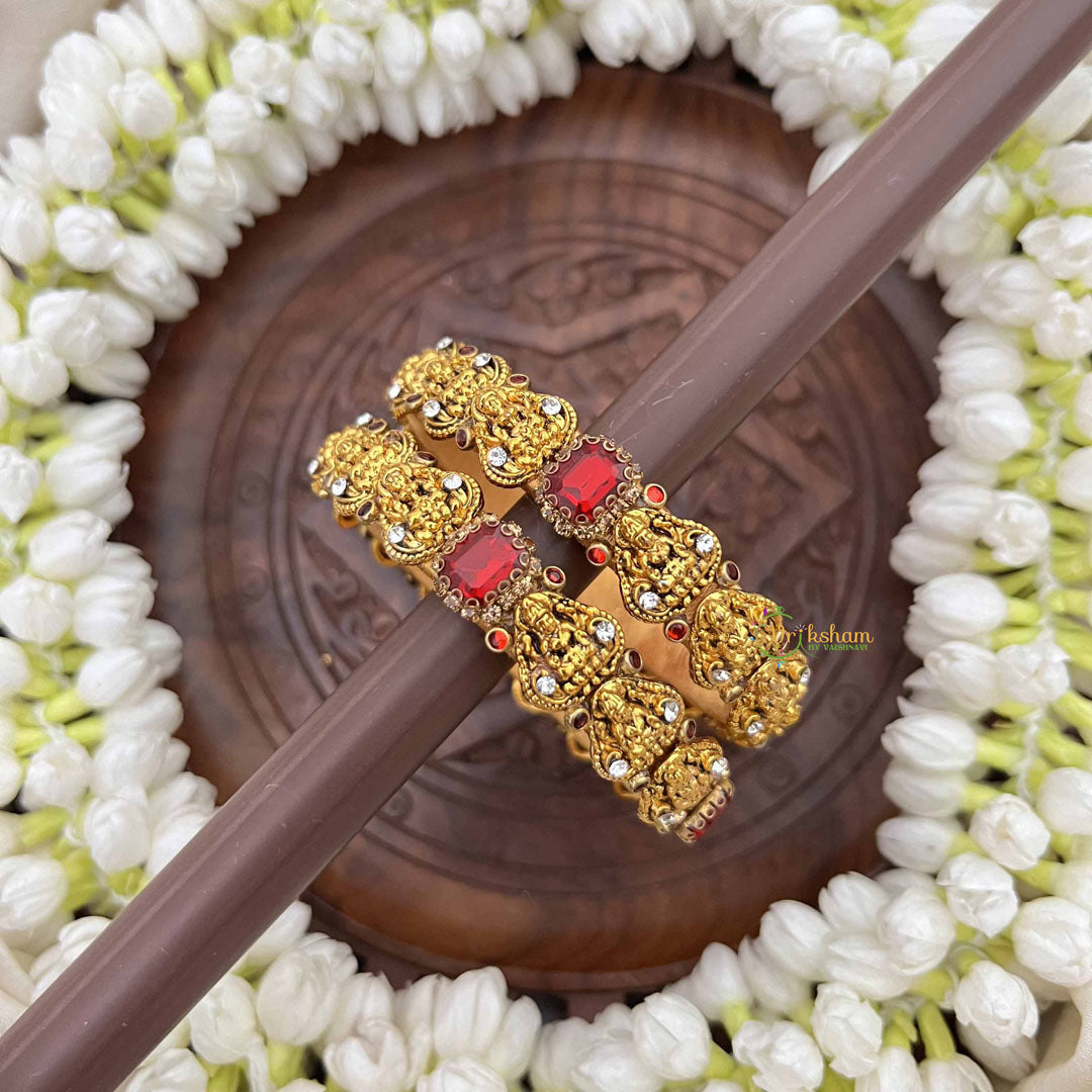 Elevate your wrist with these exquisite Lakshmi bangles, where timeless elegance meets spiritual significance. Crafted with graceful gold detailing, each bangle features vibrant red crystal stones that catch the light beautifully. The Lakshmi motif symbolizes prosperity and abundance, making these pieces both a stunning accessory and a meaningful adornment. Perfect for festive occasions, celebrations, or everyday wear, these bangles blend traditional artistry with contemporary sophistication. A versatile addition to any jewelry collection that radiates grace and cultural richness.