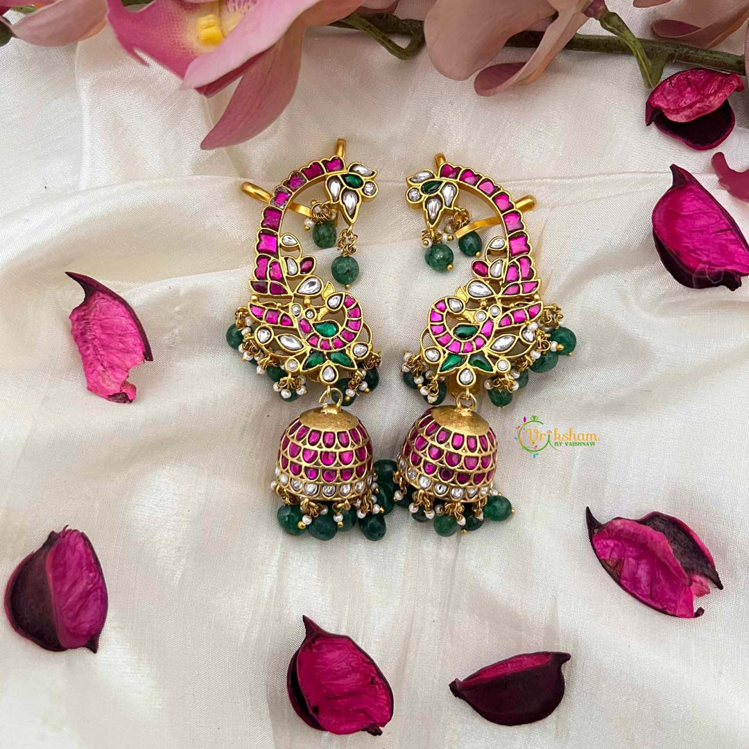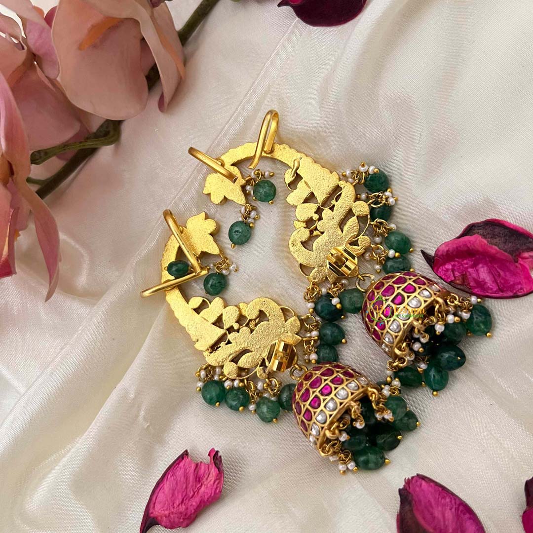 Command attention with these grand kaan-style jhumkas, a statement piece rooted in authentic Indian jewelry tradition. Featuring elaborate kundan and jadau work, these earrings showcase intricate detailing that reflects centuries of artisanal mastery. Vibrant green beads punctuate the design, creating visual richness and cultural authenticity. The integrated earcuff design offers a distinctive silhouette that frames the face beautifully while ensuring comfortable, secure wear. Ideal for weddings, festivals, and celebrations demanding presence and prestige, these jhumkas embody opulence without ostentation. Each pair represents a commitment to heritage craftsmanship and timeless elegance, making them an heirloom-worthy investment for those who appreciate jewelry as both art and cultural expression.