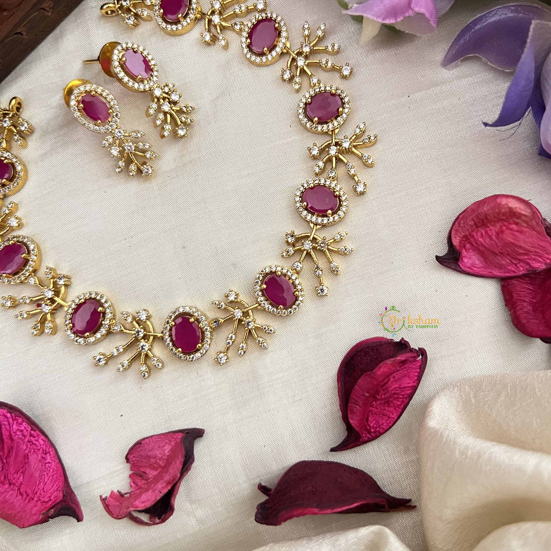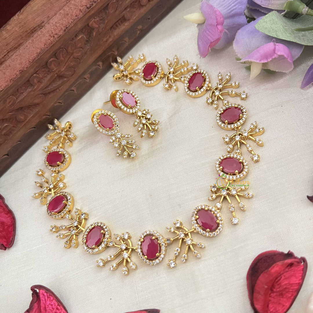This striking neckpiece features a grand oval shape adorned with delicate leaf motifs and vibrant red AD stones. Its sophisticated design blends bold elegance with intricate detailing, making it an ideal statement accessory for formal occasions and celebrations.