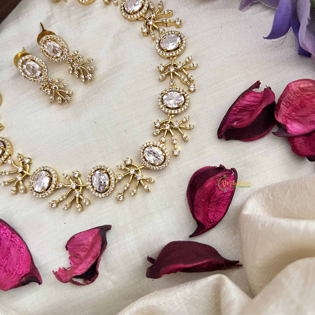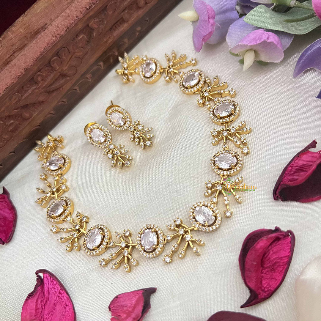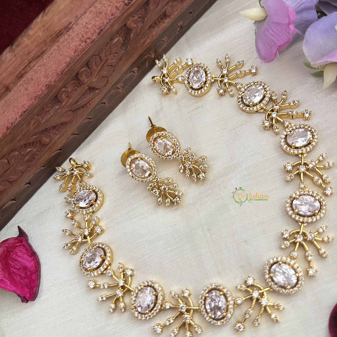 This elegant neckpiece showcases a grand oval design accented with intricate leaf motifs and sparkling white AD stones. Combining timeless sophistication with refined craftsmanship, it lends a graceful, polished finish to any formal ensemble.