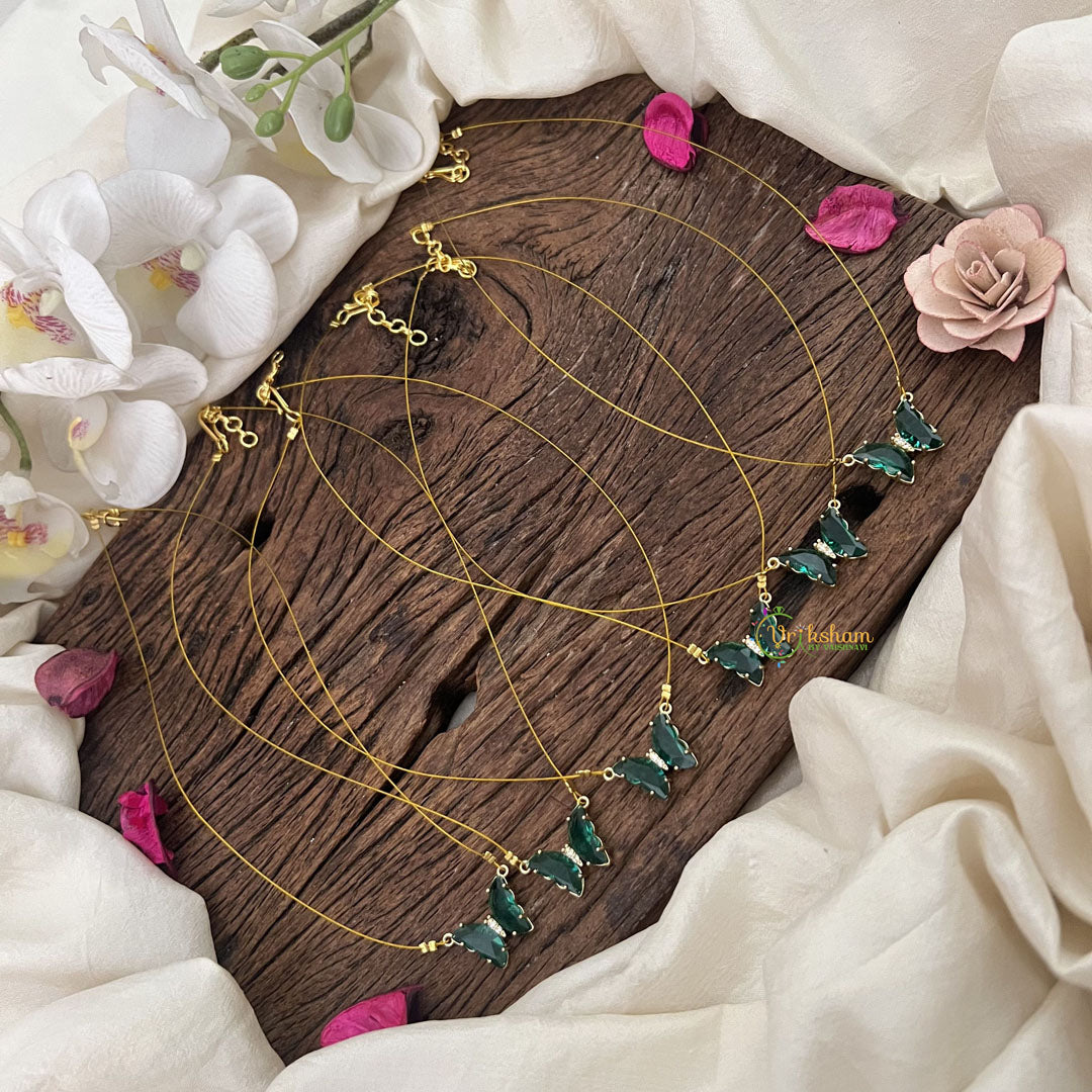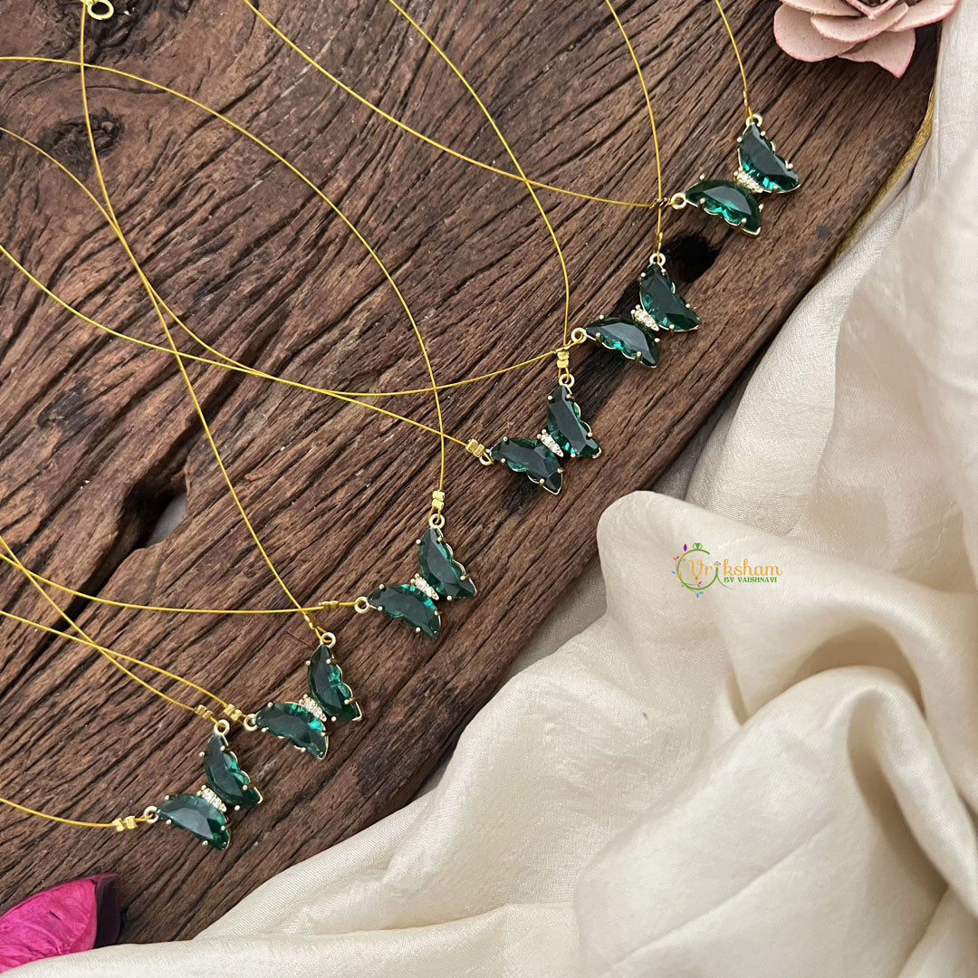 The Vriksham Green Butterfly Pendant Invisible Chain set features six delicate chains, each adorned with a charming green butterfly pendant. Designed with an invisible chain style, this sophisticated collection offers a subtle yet elegant accessory perfect for gifting. Its refined beauty adds a graceful touch to any