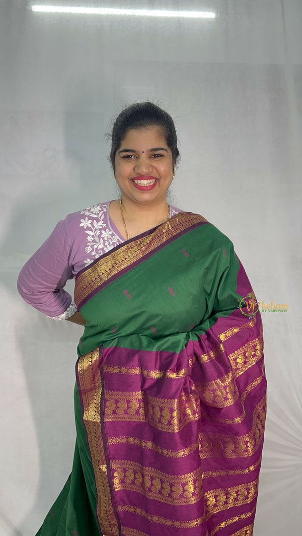 Celebrate refined beauty with this stunning Kalyani cotton saree, showcasing a vibrant green palette accented by a luxurious dark pink border and intricate butta patterning. Woven from premium Kalyani cotton, the fabric provides exceptional comfort and breathability, ensuring effortless elegance throughout the day. The striking interplay between emerald green and deep mauve-pink creates a sophisticated, contemporary aesthetic ideal for festive occasions, weddings, and formal gatherings. The ornamental butta design showcases authentic Indian weaving heritage and adds dimensional richness to the piece. Natural Kalyani cotton guarantees superior drape, longevity, and easy maintenance. This versatile saree appeals to the discerning woman who appreciates bold color combinations, cultural craftsmanship, and timeless style—a thoughtfully curated investment that seamlessly transitions across occasions with understated glamour and enduring sophistication.