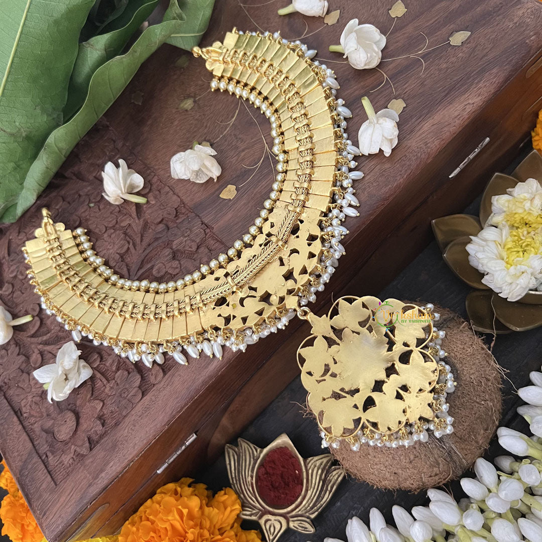 The Vriksham Green Dot Floral Pendant Short Neckpiece features a refined design accented with vibrant green dots and delicate floral motifs, complemented by elegant rice pearls. This sophisticated piece adds a subtle yet striking charm, perfect for enhancing both traditional and contemporary outfits.