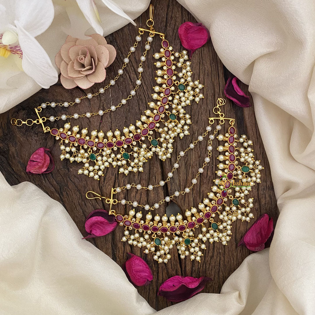 Elevate your style with our Vriksham 3 Layered Pearl maatil /Ear Chain. Crafted with intricate details and luxurious pearls, this ear chain exudes elegance and sophistication. Experience the perfect blend of tradition and modernity with this statement piece. Complete your look with our Vriksham 3 Layered Pearl maatil /Ear Chain.