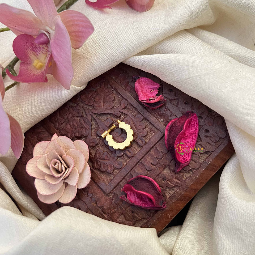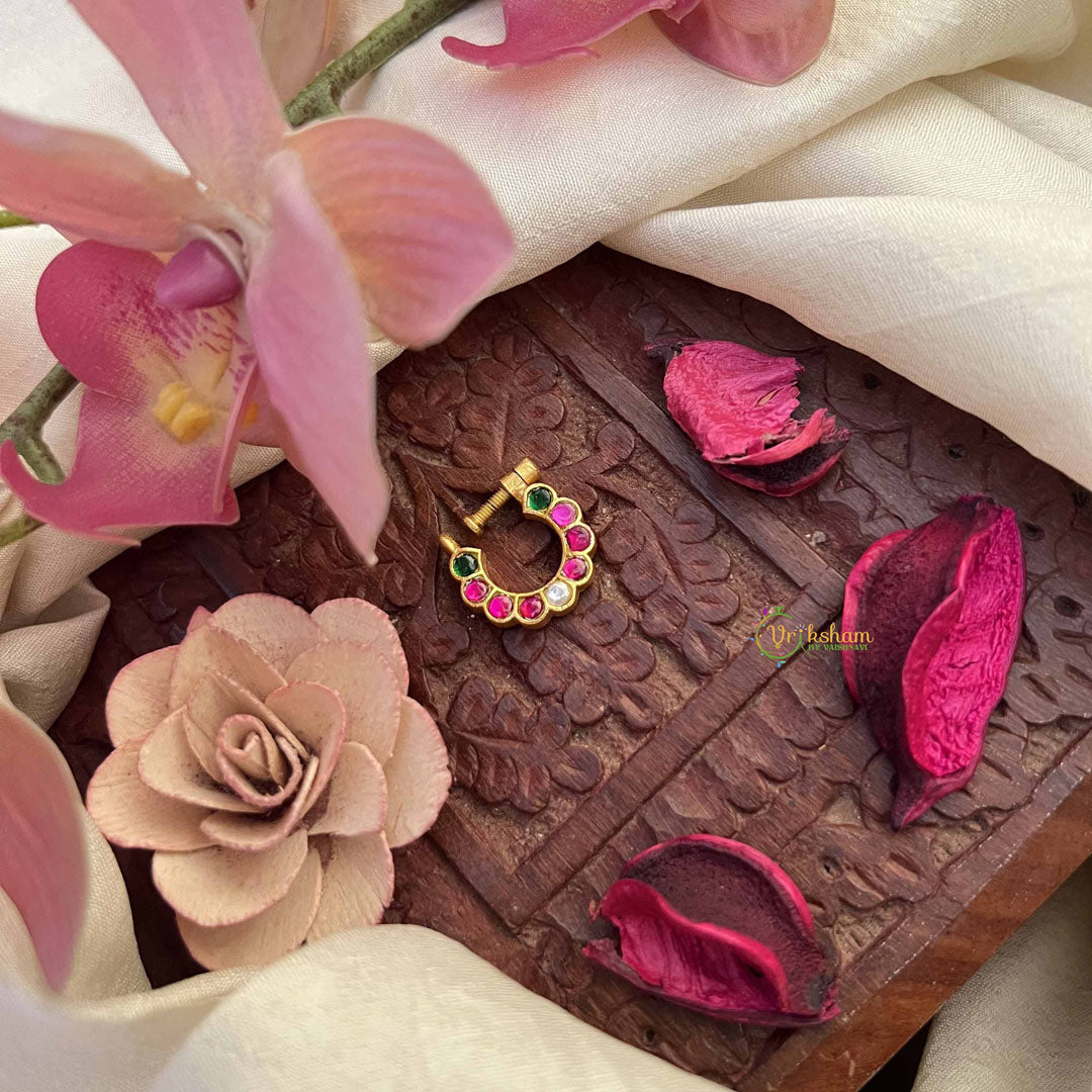 The Vriksham Half Circle Style Nath showcases a refined blend of red, white, and green stones set in exquisite Jadau craftsmanship. Designed for a secure press fit, this nose pin adds a graceful touch of color and sophistication to traditional attire, perfect for elevating your festive and ceremonial looks.