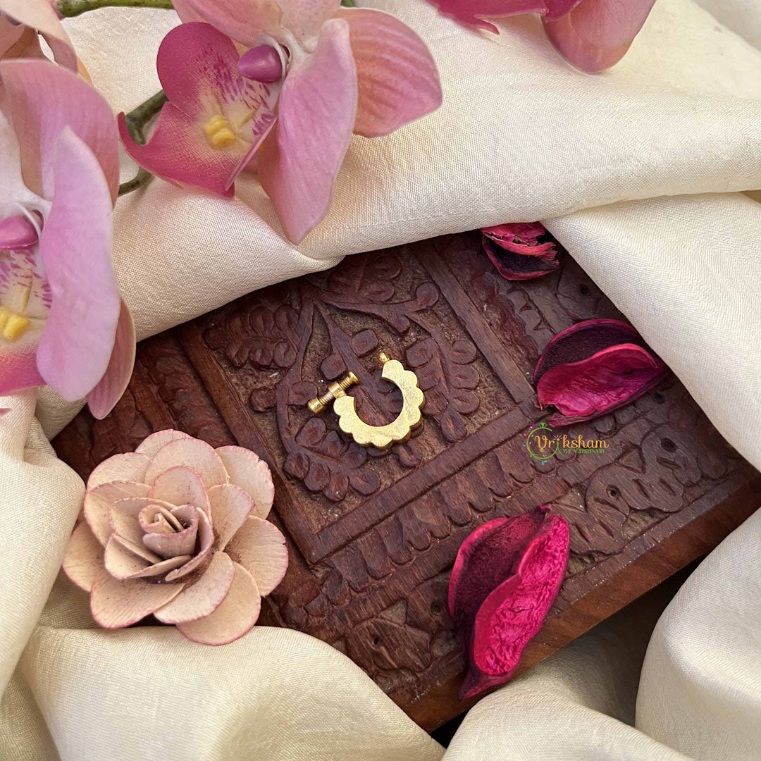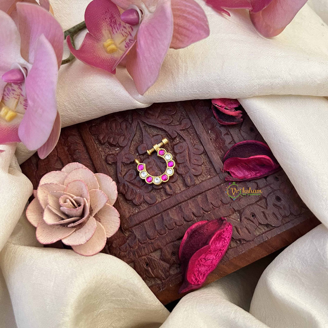 Discover elegance in every detail with the Vriksham Half Circle Style Nath, adorned with striking red and white stones set in classic Jadau craftsmanship. This press-fit nose pin offers both style and comfort, perfectly enhancing your traditional look with a subtle yet sophisticated charm.
