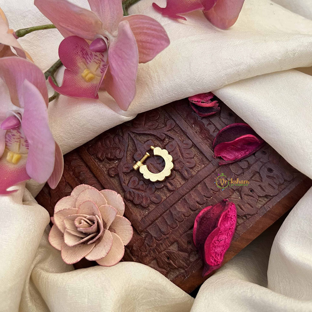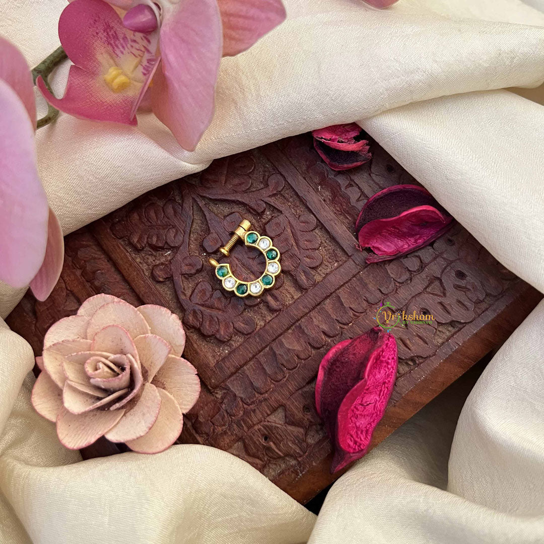 Embrace understated elegance with the Vriksham Half Circle Style Nath, featuring a delicate combination of white and green stones crafted in classic Jadau style. This press-fit nose pin offers refined beauty and comfort, adding a subtle yet distinctive accent to your traditional ensemble.