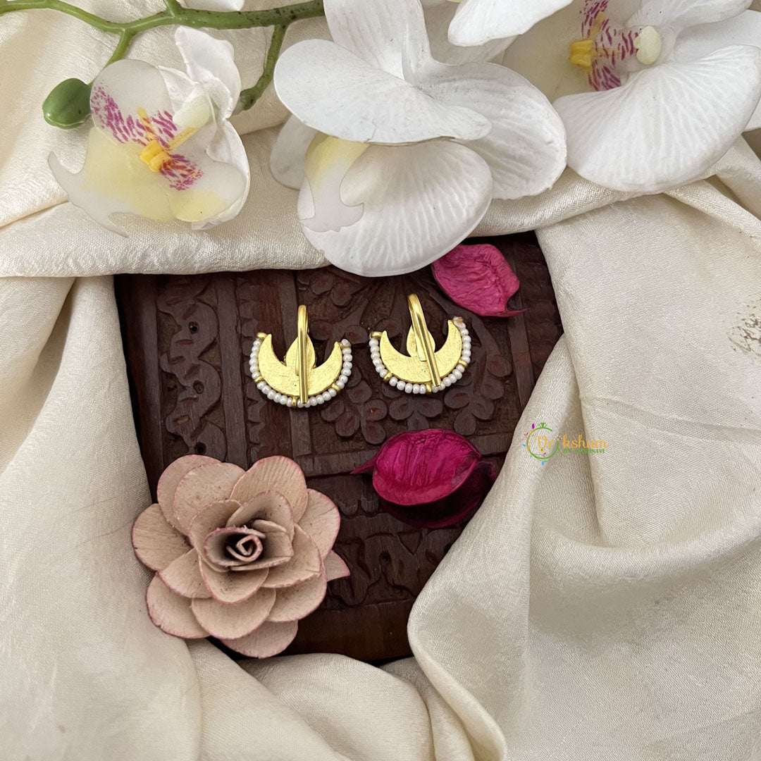 The Vriksham Half Moon & Diya With Pearl Kundan Jadau Press Bugadi in red, white, and green features an exquisite blend of half moon and diya motifs, enhanced with delicate pearl accents. Crafted with intricate kundan and jadau work, this sophisticated accessory adds a graceful and timeless elegance to traditional attire, perfect for special occasions and celebrations.