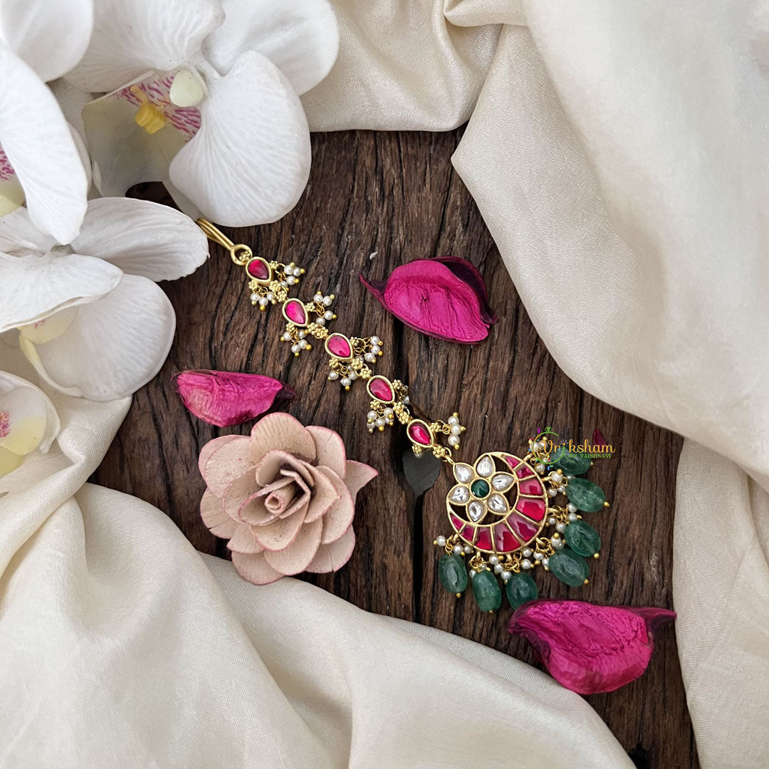 The Vriksham Half Moon & Floral Round Kundan Jadau Maang Tikka combines elegant half-moon and floral motifs, enhanced with green beads and intricate Kundan Jadau craftsmanship. This sophisticated piece offers a refined blend of traditional design and modern elegance, perfect for adding a graceful touch to your bridal or festive attire.
