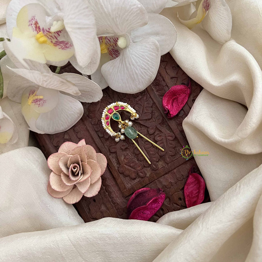 The Vriksham Half Moon Kundan Jadau Jada Billai features a graceful half-moon design embellished with red, green, and white stones, enhanced by lustrous pearls. This elegant accessory elevates traditional hairstyles with its refined craftsmanship, perfect for weddings and festive occasions, adding a touch of timeless sophistication.
