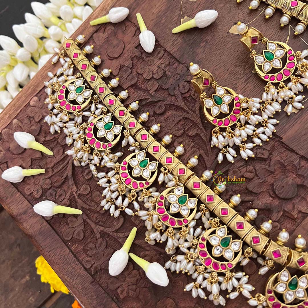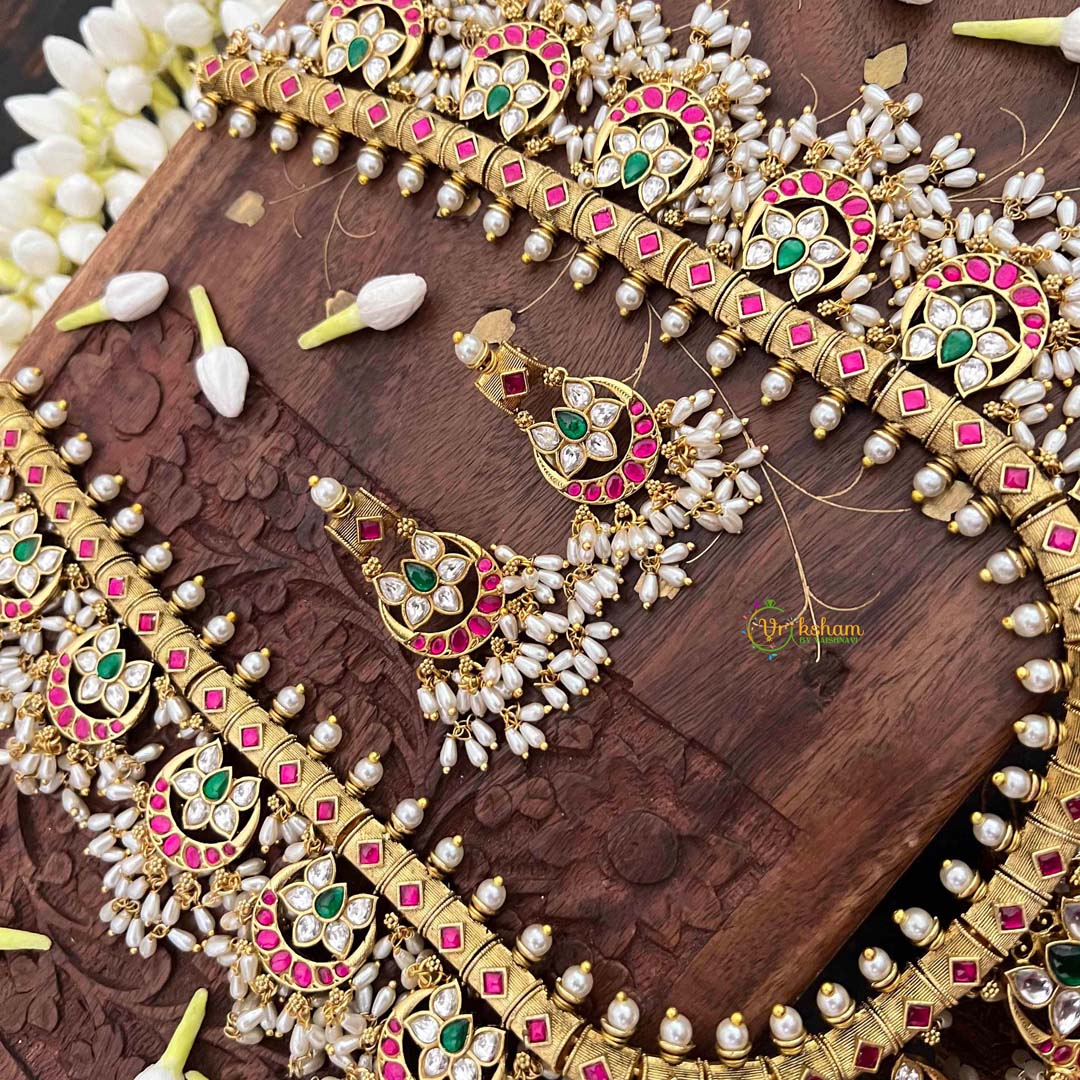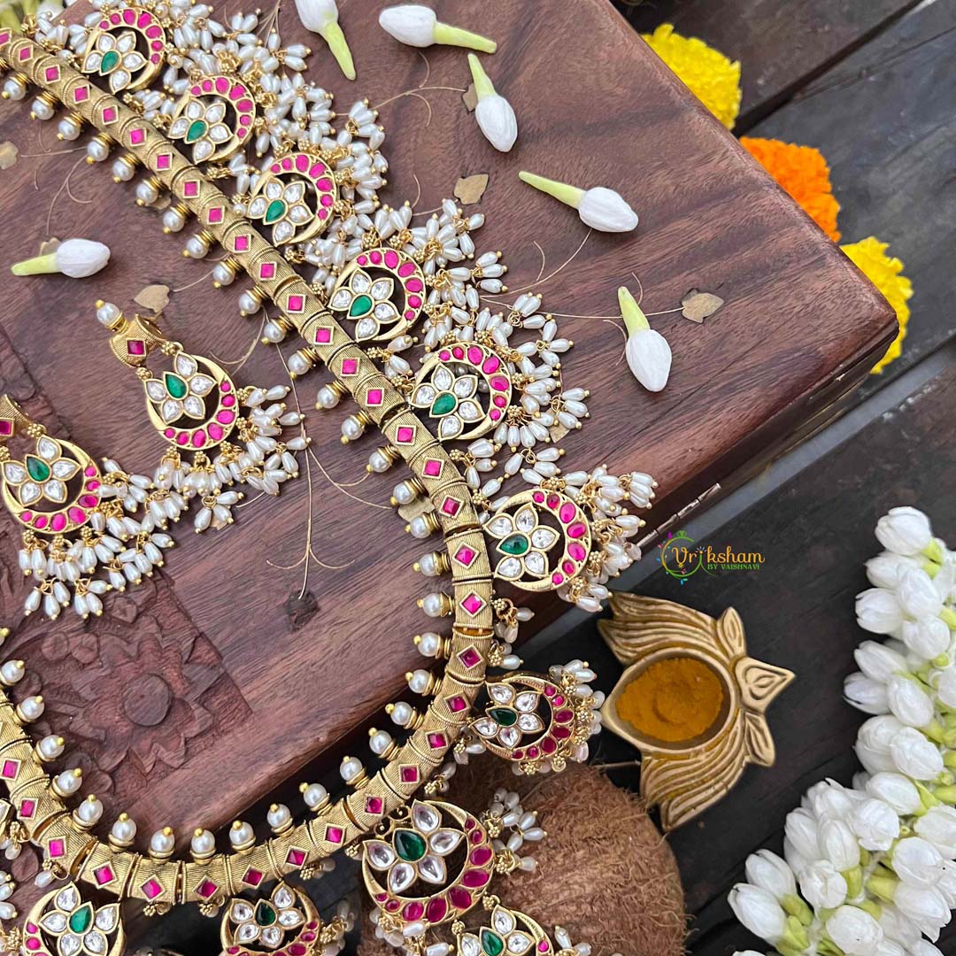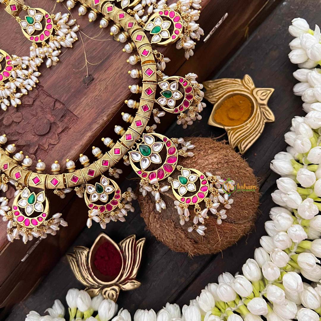 Embrace celestial mystique with this Half Moon & Lotus Style Kundan Jadau neckpiece, where moonlit elegance meets sacred floral symbolism. Brilliant kundan stones are meticulously set to capture light with mesmerizing radiance, while luminous rice pearls create an ethereal quality throughout the composition. The lotus and crescent moon motifs carry profound spiritual significance, rendered through traditional guttapusalu craftsmanship that demonstrates exceptional artisanal mastery. This generously extended neckpiece drapes with effortless sophistication, ideal for brides and discerning collectors who appreciate jewelry as wearable art. Each detail reflects centuries of heritage technique, offering a timeless piece that honors both celestial beauty and devotional reverence with understated opulence.
