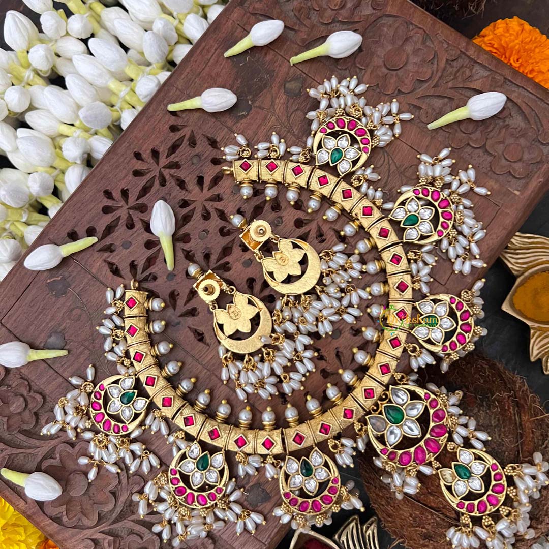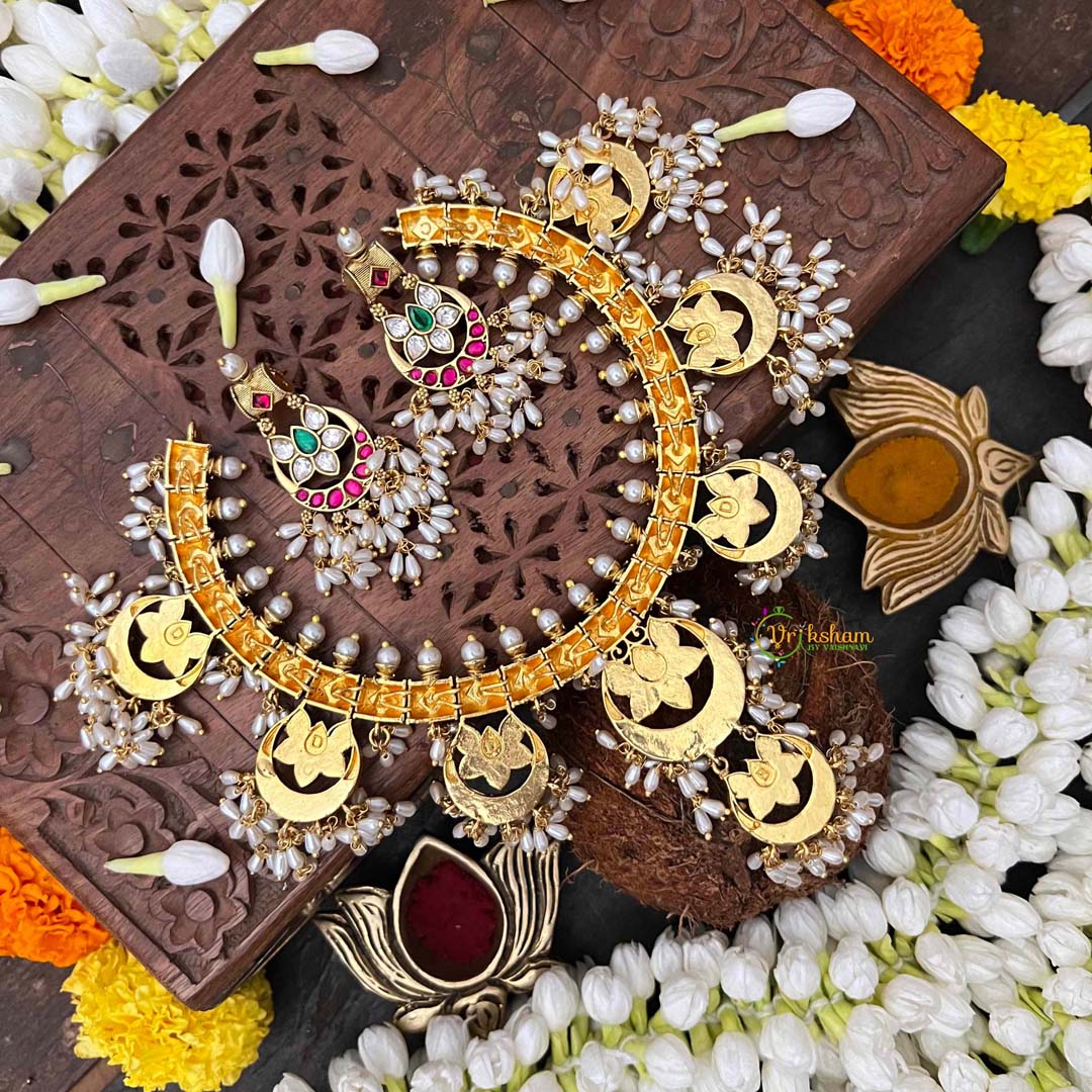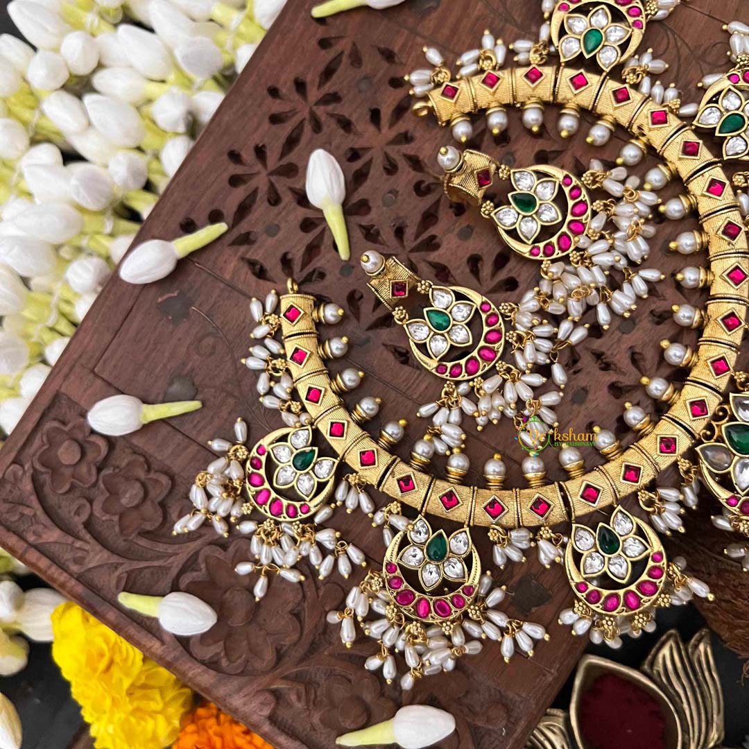 Embrace celestial and botanical elegance with this Half Moon & Lotus Style Kundan Jadau Guttapusalu Short Neckpiece, a poetic fusion of symbolic motifs. The crescent moon and sacred lotus intertwine in exquisite kundan work, adorned with lustrous rice pearls that shimmer with ethereal radiance. The guttapusalu granulation technique creates a distinctive textured surface that captures light beautifully, while jadau setting guarantees each pearl is individually secured with exceptional artistry. These timeless symbols—the moon representing serenity and the lotus embodying purity and enlightenment—combine to create a piece of profound spiritual significance. Perfect for weddings, spiritual occasions, or those who appreciate jewelry infused with meaning, this short neckpiece drapes gracefully along the collarbone. A distinguished heirloom for those who seek beauty that transcends aesthetics and honors ancient traditions.