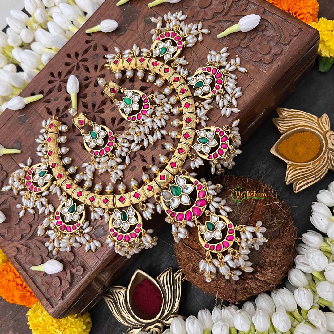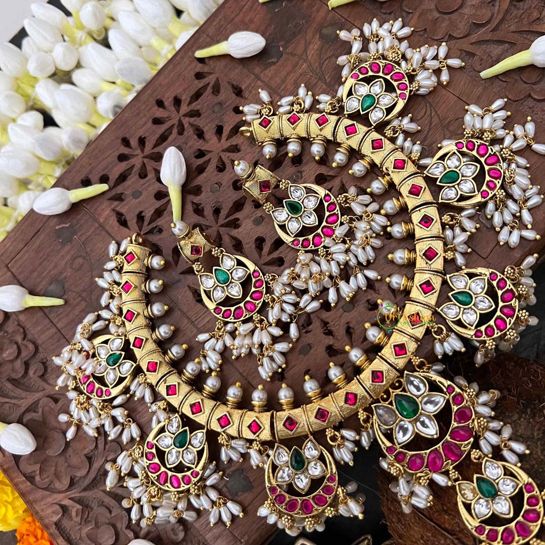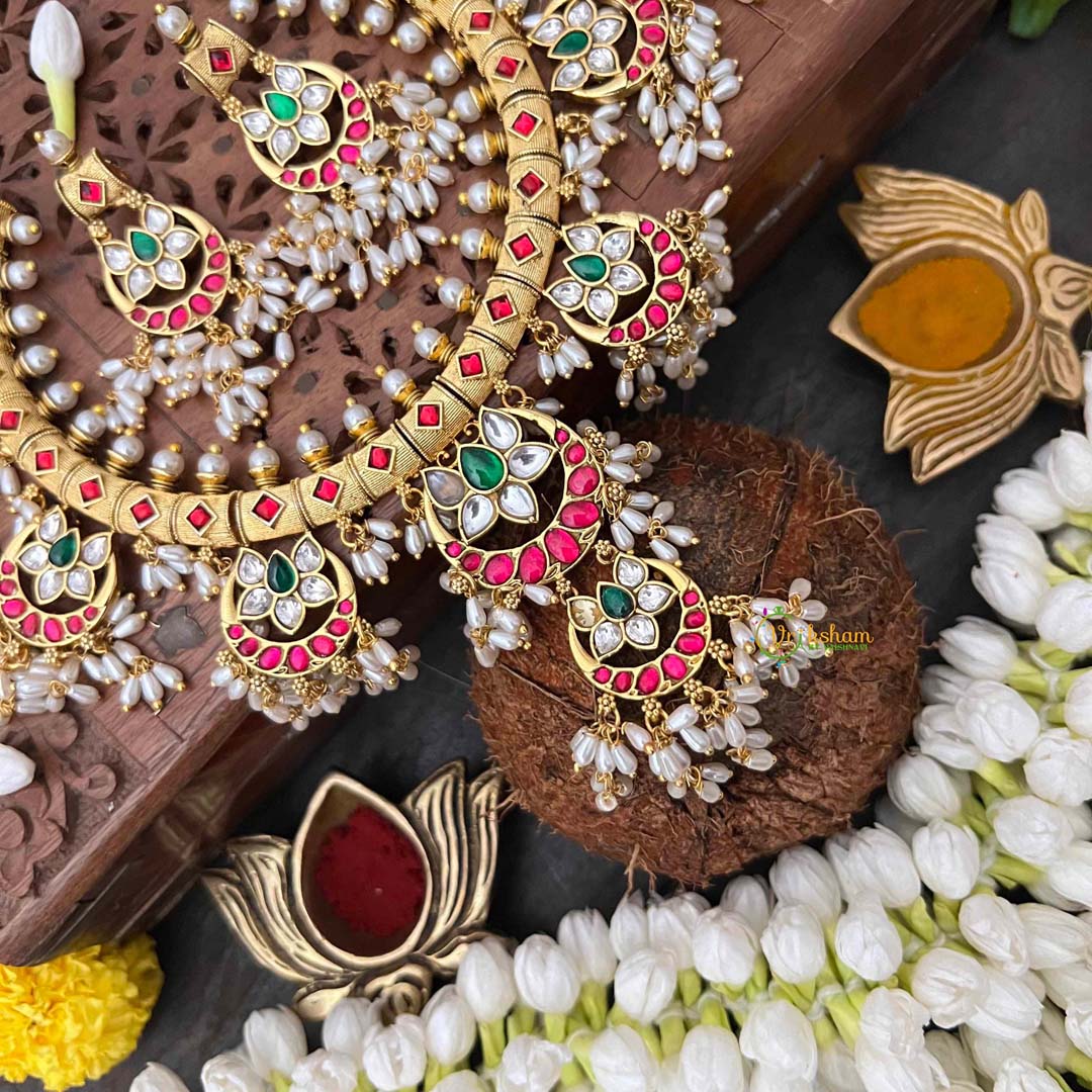 Embrace celestial and botanical elegance with this Half Moon & Lotus Style Kundan Jadau Guttapusalu Short Neckpiece, a poetic fusion of symbolic motifs. The crescent moon and sacred lotus intertwine in exquisite kundan work, adorned with lustrous rice pearls that shimmer with ethereal radiance. The guttapusalu granulation technique creates a distinctive textured surface that captures light beautifully, while jadau setting guarantees each pearl is individually secured with exceptional artistry. These timeless symbols—the moon representing serenity and the lotus embodying purity and enlightenment—combine to create a piece of profound spiritual significance. Perfect for weddings, spiritual occasions, or those who appreciate jewelry infused with meaning, this short neckpiece drapes gracefully along the collarbone. A distinguished heirloom for those who seek beauty that transcends aesthetics and honors ancient traditions.