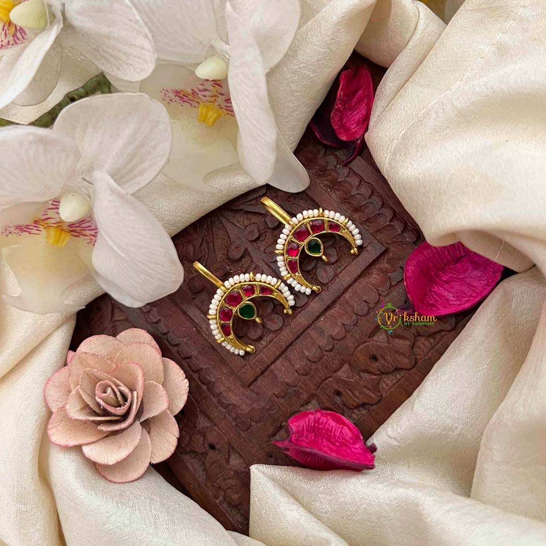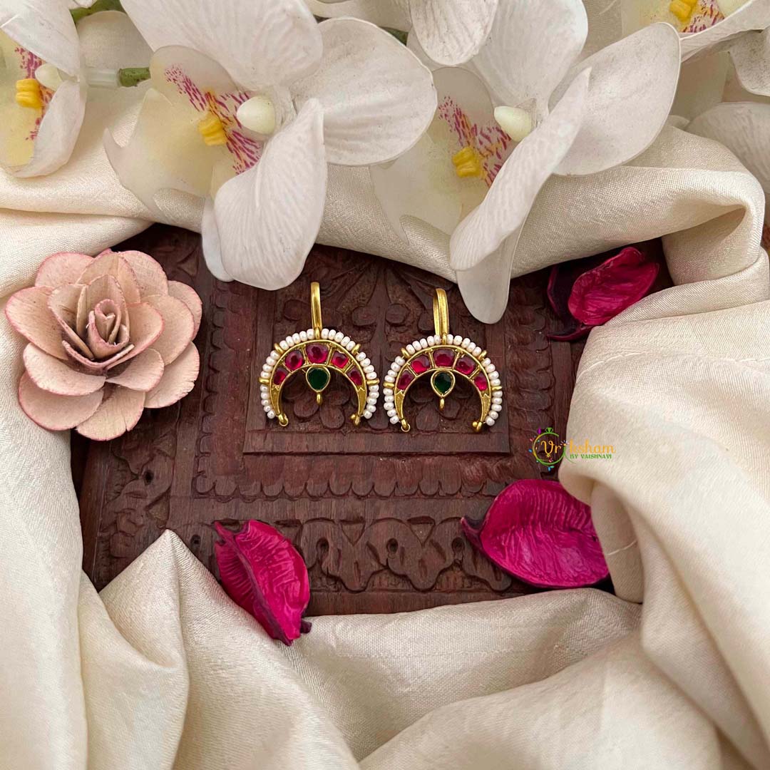 Embrace vibrant sophistication with this Half Moon Style Kundan Jadau Bugadi, a striking fusion of complementary motifs in rich red and verdant green. The elegant crescent combined with graceful pear-shaped pendants creates a dynamic composition that celebrates both symmetry and movement. Exquisite pearl detailing enhances each element, creating a luminous interplay that radiates with every gesture. The bold red and green palette evokes festive grandeur while maintaining refined elegance, making this piece ideal for weddings, celebrations, and momentous occasions. Every facet showcases meticulous artisanal craftsmanship, with authentic Jadau techniques guaranteeing both visual splendor and lasting durability. A distinguished accessory that honors traditional heritage while delivering contemporary vibrancy, this bugadi stands as a treasured investment in timeless beauty and enduring prestige.