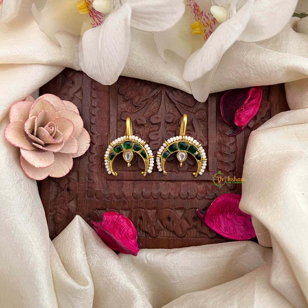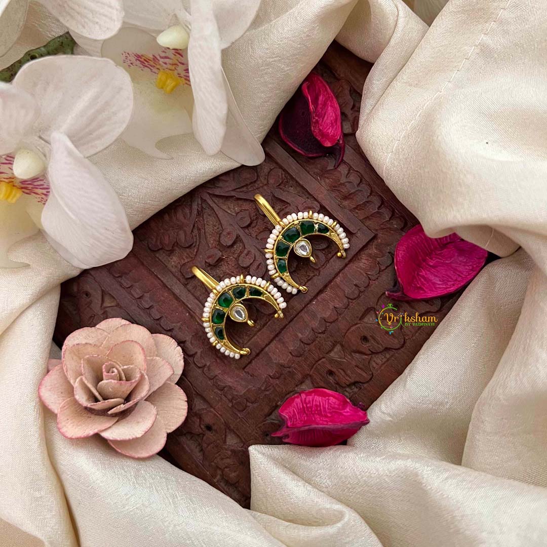 Experience refined elegance with this Half Moon Style Kundan Jadau Bugadi, a captivating composition of dual motifs in white and green. The graceful crescent paired with delicate pear-shaped drops creates a harmonious design that balances geometric precision with organic fluidity. Lustrous pearl detailing adorns each element, catching light with mesmerizing radiance and adding dimensional depth. The serene white and verdant green palette evokes natural tranquility while maintaining sophisticated allure, making this piece perfect for weddings, celebrations, and cherished occasions. Every detail reflects meticulous artisanal mastery, with authentic Jadau techniques ensuring both aesthetic brilliance and exceptional longevity. A distinguished accessory that honors heritage craftsmanship while delivering contemporary refinement, this bugadi stands as a timeless treasure that elevates any ensemble with grace and enduring prestige.