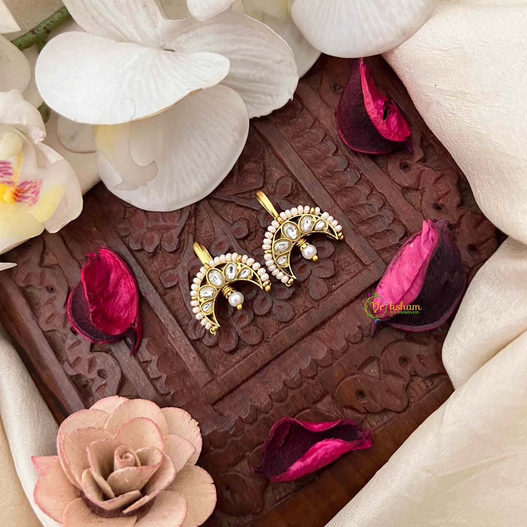 Discover refined elegance with this Half Moon Pearl Detailing Kundan Jadau Bugadi, a masterpiece of traditional Indian jewelry artistry. Featuring gracefully curved half-moon designs embellished with lustrous pearls and intricately set gemstones using authentic kundan and jadau techniques, this piece radiates understated luxury. The pearl detailing adds a luminous quality that catches light beautifully, making it an ideal choice for weddings, celebrations, and formal occasions. Each element is carefully crafted to showcase the heritage of skilled artisans, creating a timeless accessory that elevates any traditional or contemporary ensemble with sophisticated charm.
