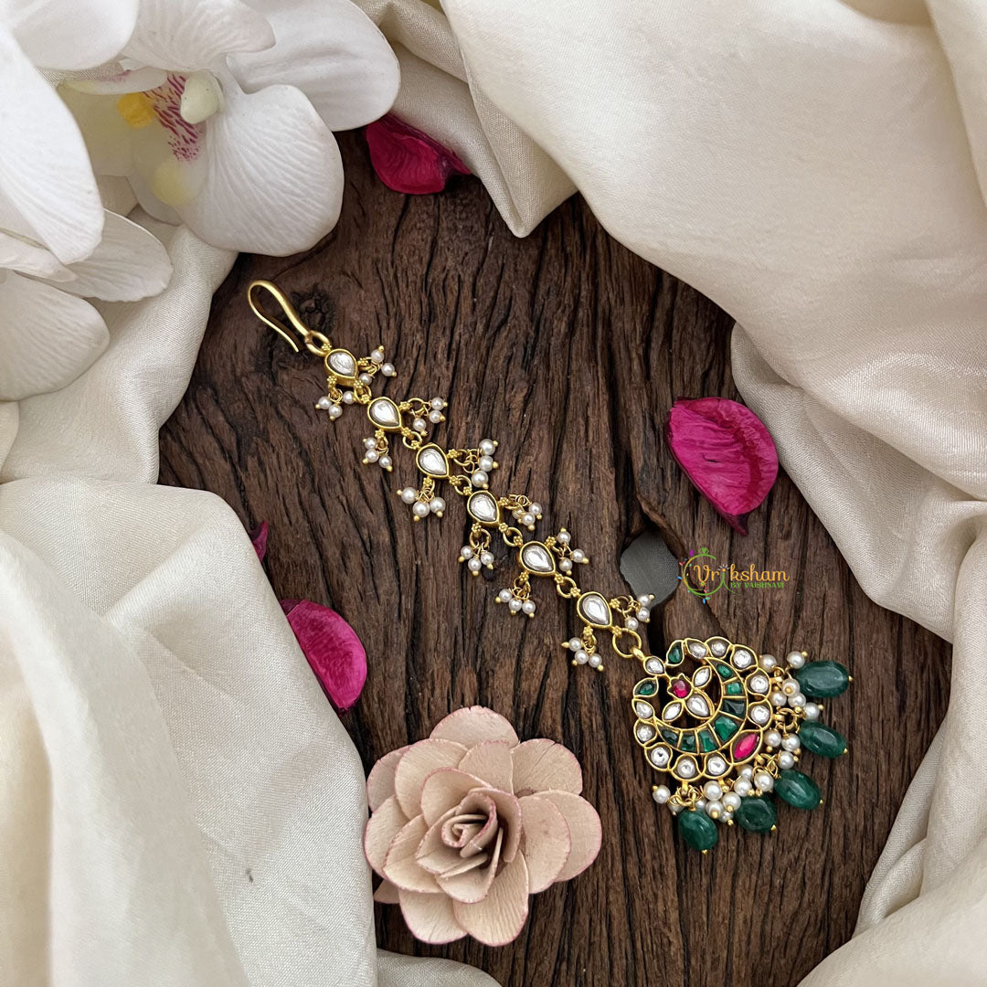 Enhance your elegance with our Vriksham Half Moon Style Jadau Kundan Maang Tikka. Handcrafted with exquisite green white stones, this tikka radiates luxury and sophistication. The half moon design adds a touch of uniqueness, making it a must-have accessory for all your special occasions. Elevate your style with Vriksham.