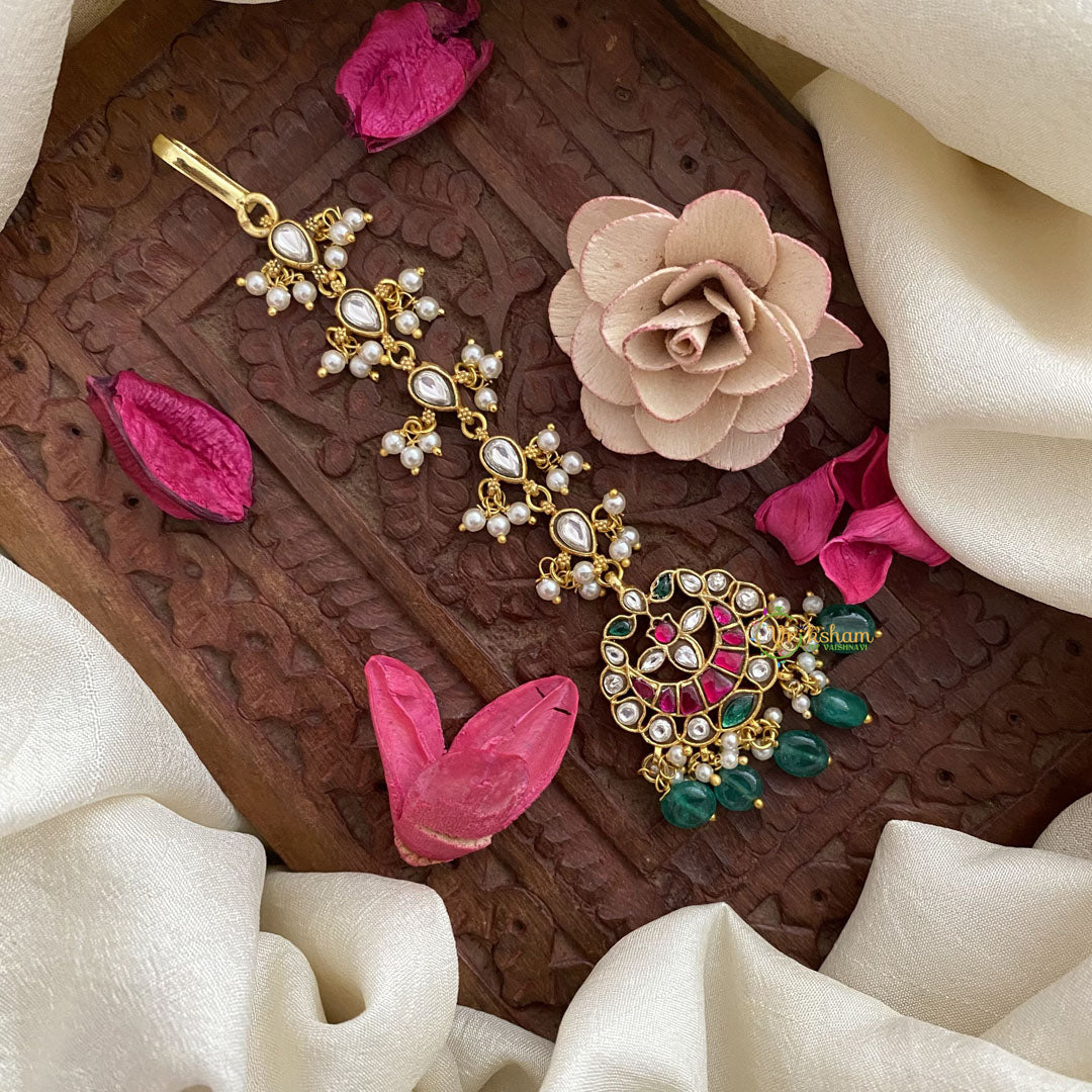 Enhance your elegance with our Vriksham Half Moon Style Jadau Kundan Maang Tikka. Handcrafted with exquisite red white stones, this tikka radiates luxury and sophistication. The half moon design adds a touch of uniqueness, making it a must-have accessory for all your special occasions. Elevate your style with Vriksham.