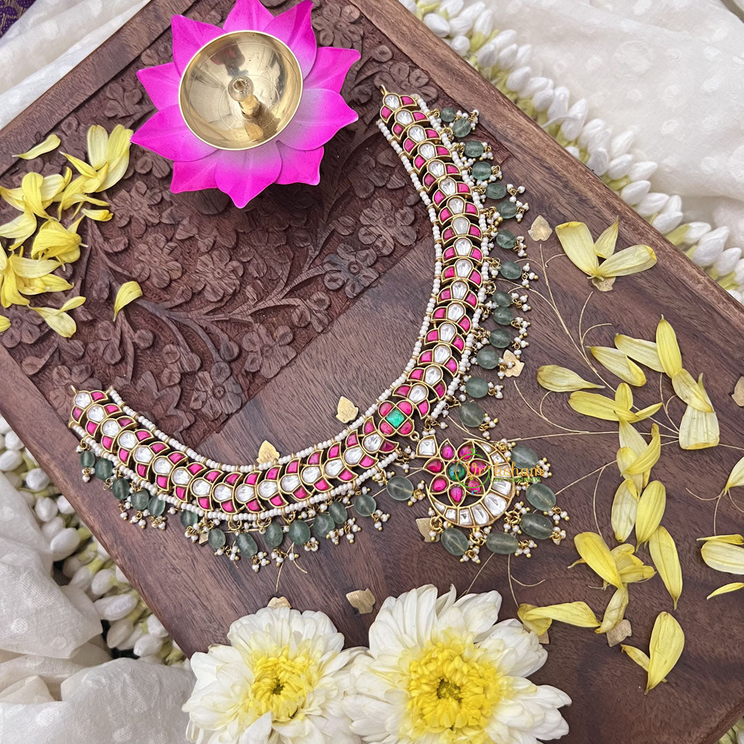The Vriksham Half Moon Style Pendant Jadau Kundan Short Neckpiece features a delicate half-moon pendant adorned with exquisite kundan and jadau work. Accented by soft pastel green beads, this piece offers a sophisticated blend of traditional artistry and contemporary elegance, perfect for elevating your ensemble with subtle grace.