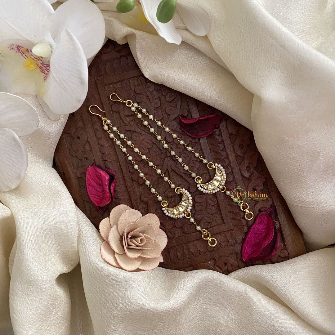 Elevate your look with Vriksham's Half Moon Style Single Strand White Pearl Maatil necklace. This luxurious piece features a unique half-moon design and stunning white pearls, exuding elegance and sophistication. Add a touch of artistry and refinement to your outfit with this exclusive necklace.
