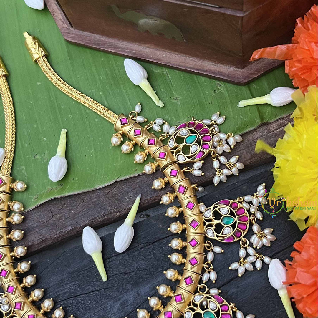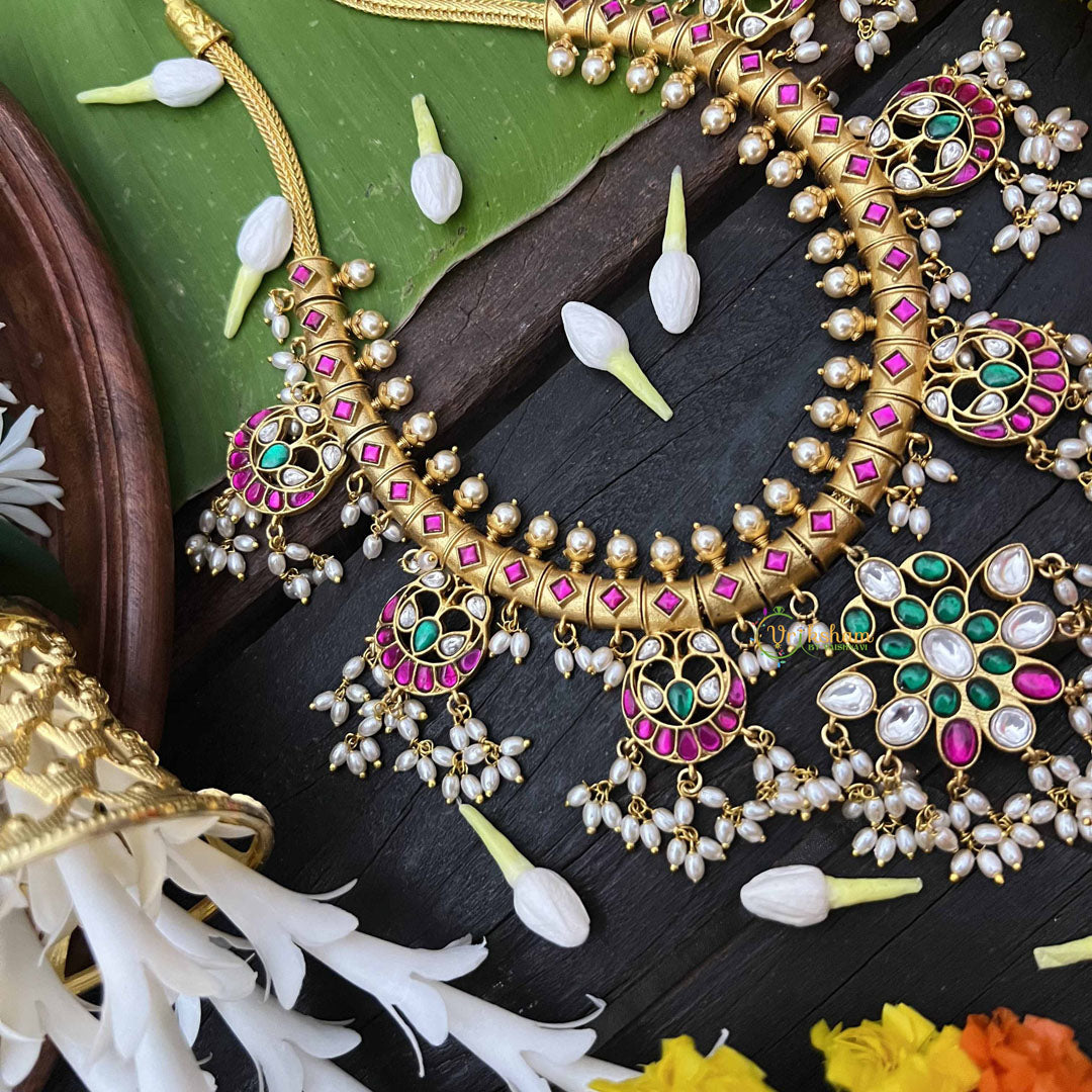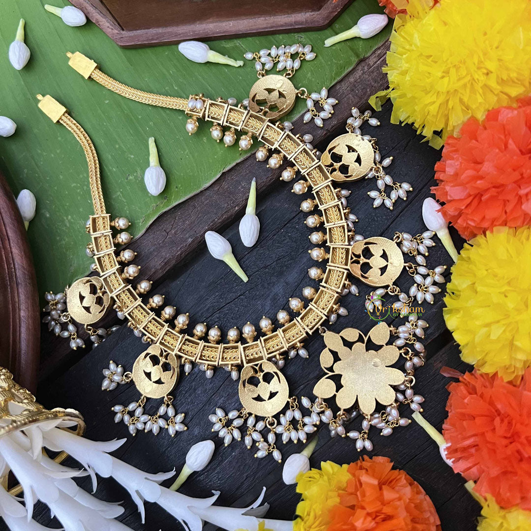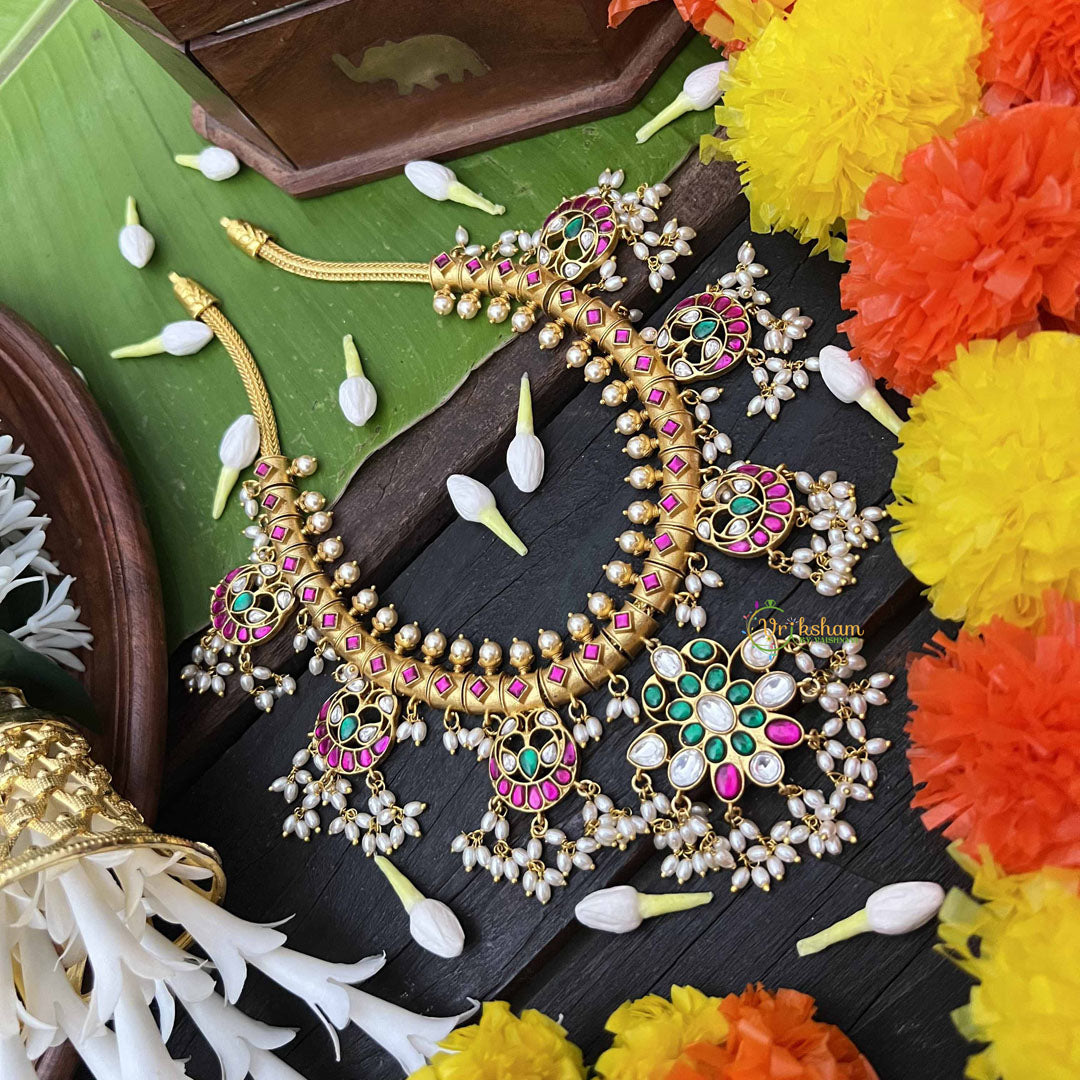 Celebrate ethereal beauty with this enchanting Half Moon & Butterfly pendant neckpiece, a poetic interpretation of nature-inspired jewelry design. Featuring delicate guttapusalu craftsmanship adorned with lustrous rice pearls, this short neckpiece exudes understated sophistication and timeless charm. The half moon and butterfly motifs symbolize transformation, grace, and celestial wonder, making it a meaningful choice for those who appreciate symbolic adornment. The luminous pearl strand creates a soft, elegant aesthetic that transitions seamlessly from traditional ceremonies to contemporary occasions. Meticulously handcrafted with refined artistry, this piece captures the essence of classical Indian jewelry while maintaining a modern sensibility, perfect for the discerning wearer seeking distinctive elegance.