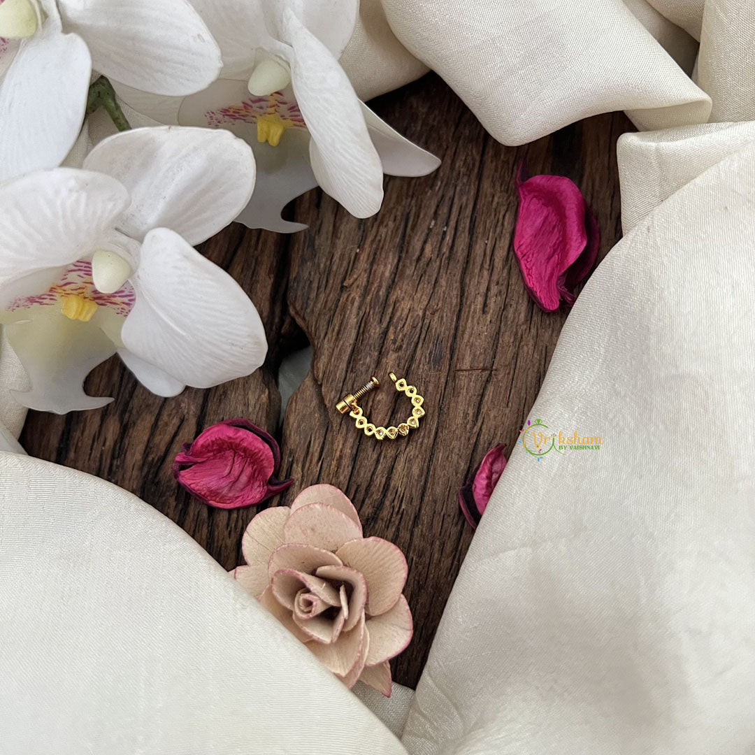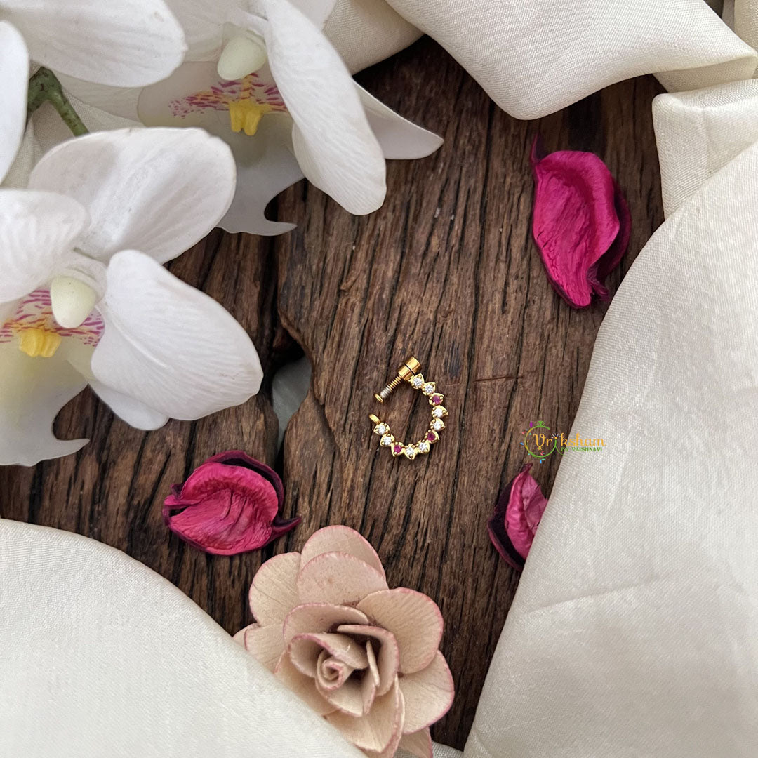 The Vriksham Half Round Naths features a refined blend of red and white tones in a graceful half-round design. This meticulously crafted nose pin combines traditional elegance with modern simplicity, offering a sophisticated accessory that adds a subtle yet captivating accent to your ensemble.