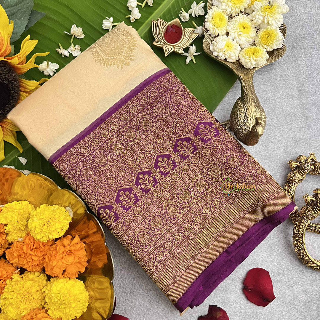 The Vriksham Half White with Purple Kanchi Pure Silk Saree beautifully blends simplicity and tradition. Featuring a pristine white body paired with a rich purple Kanchi border, this saree showcases pure silk craftsmanship with elegant detailing. Its graceful drape and understated charm make it perfect for sophisticated events and cultural celebrations.