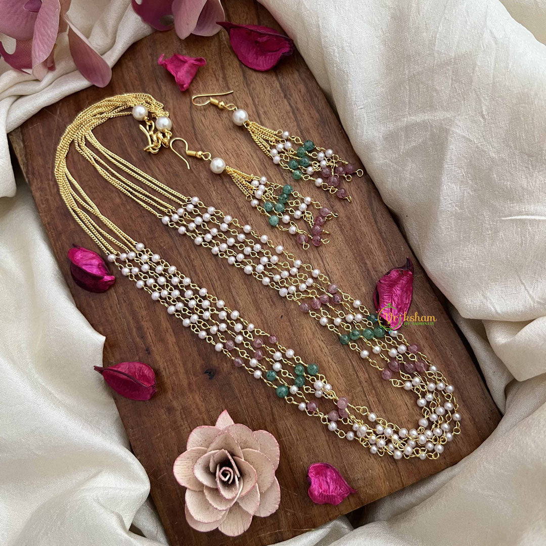 The Vriksham Handcrafted Ethnic Statement 5 Layered Green & Red Pearl Beaded Mala showcases five meticulously layered strands of vibrant green and red pearls in an elegant 18-inch design. This sophisticated necklace combines traditional craftsmanship with bold colors, making it a striking accessory that enhances ethnic attire with refined charm.