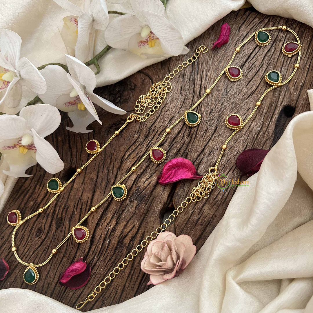 Celebrate artisanal mastery with this exquisitely handcrafted gold pear drop champ and golden ball hipchain, featuring striking red and green accents. Each element is meticulously fashioned to create a harmonious composition that balances elegance with visual richness. The alternating pear drops and golden spheres flow seamlessly, while jewel-toned details add warmth and dimension. This bespoke accessory reflects the dedication of skilled artisans who honor traditional techniques while creating contemporary pieces. Ideal for those who seek jewelry that tells a story of craftsmanship, cultural heritage, and refined personal style.