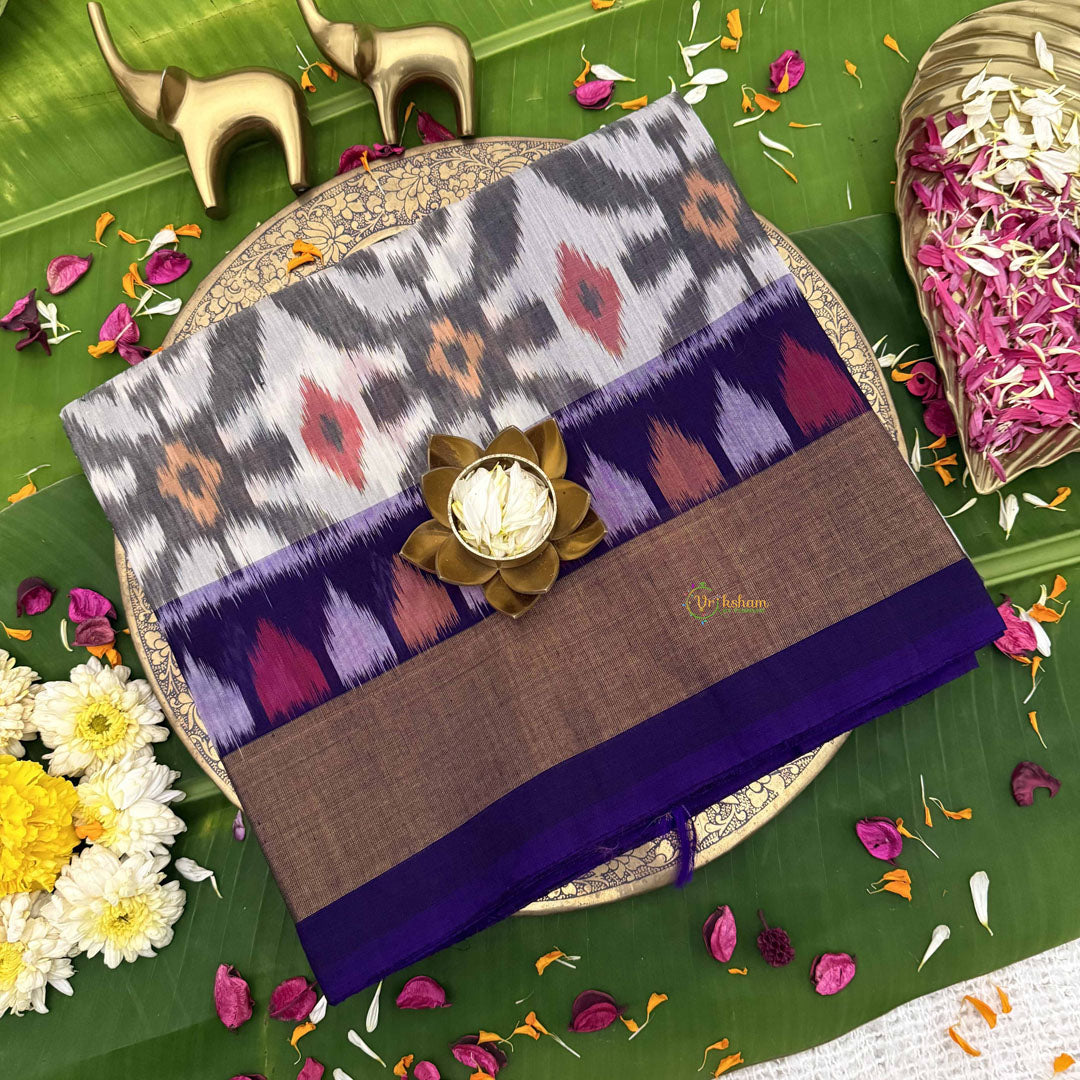 Experience timeless grace with the Vriksham Handwoven Pochampally Saree, blending grey and purple hues in elegant Ikat patterns. Crafted from silk-cotton, it offers a refined texture that combines softness with durability. This saree brings a sophisticated charm to your ensemble, perfect for formal occasions and celebrations where tradition meets style.