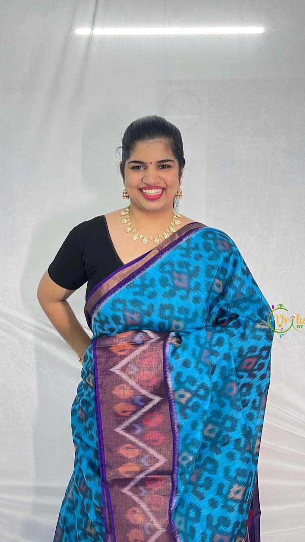 The Vriksham Handwoven Pochampally Saree in royal blue and plum showcases exquisite chevron and diamond Ikat motifs woven into a luxurious silk-cotton fabric. This meticulously crafted saree combines traditional artistry with a refined color palette, offering an elegant drape and lasting comfort. Perfect for formal occasions, it embodies sophistication and timeless beauty.