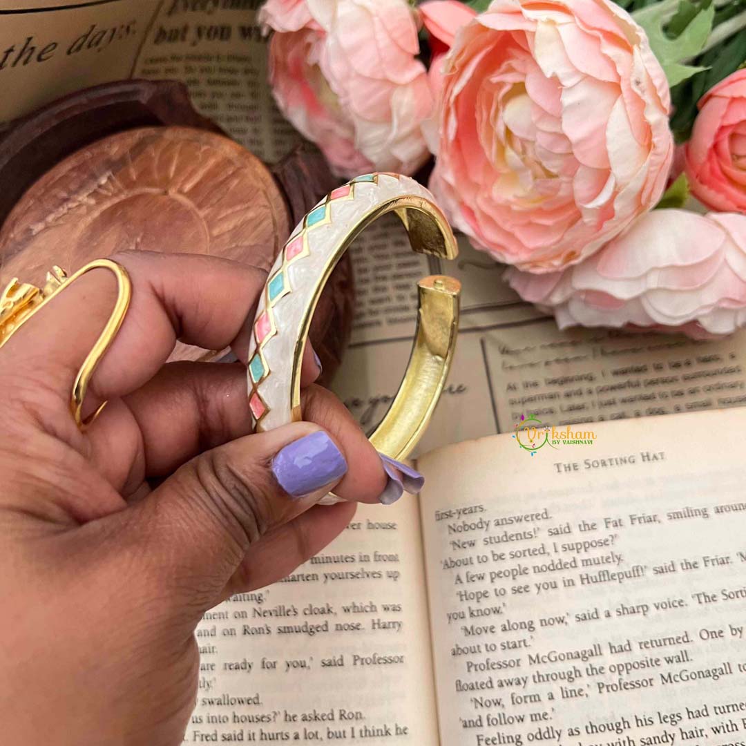 Discover timeless elegance with this sophisticated stackable kada bangle, showcasing a refined harlequin diamond pattern in serene pastel cream enamel, beautifully complemented by gold-plated accents. The geometric design exudes understated luxury through its harmonious color palette and precise craftsmanship, creating a piece that transcends fleeting trends. The luminous gold-plated detailing enhances the soft cream tones, adding warmth and subtle radiance to the overall composition. Each diamond motif is rendered with meticulous attention to detail, demonstrating exceptional artisanal skill. Versatile by nature, this bangle pairs effortlessly with other pieces for layered styling or commands attention as a standalone accessory. The neutral cream palette ensures seamless coordination with any wardrobe, making it an indispensable addition to a curated jewelry collection. A testament to refined taste and enduring craftsmanship, this piece celebrates the art of sophisticated simplicity.