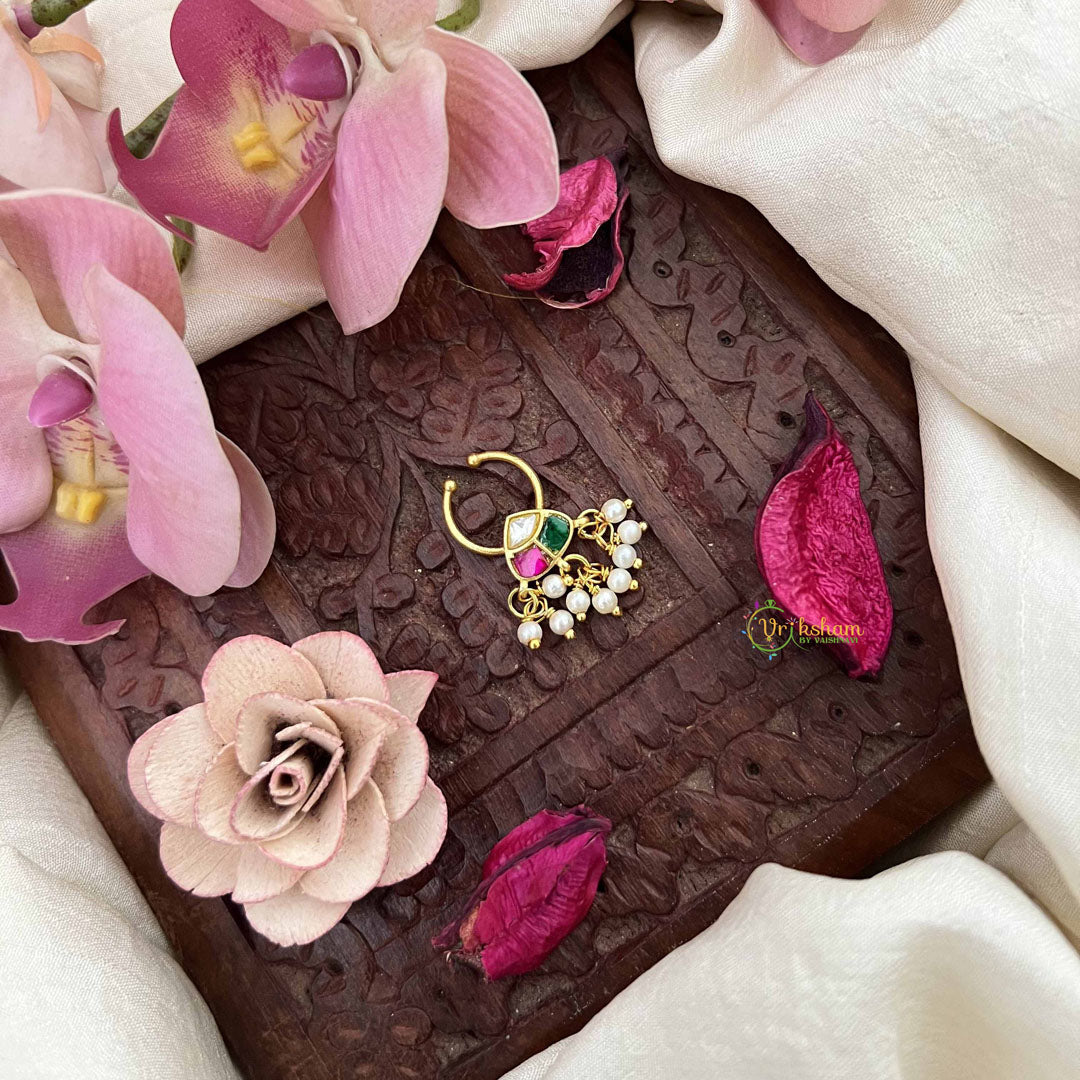 Vriksham Heritage Kundan Nath with Pearl Danglers Kundan Jadau Septum Ring-Green Red & White-J3924