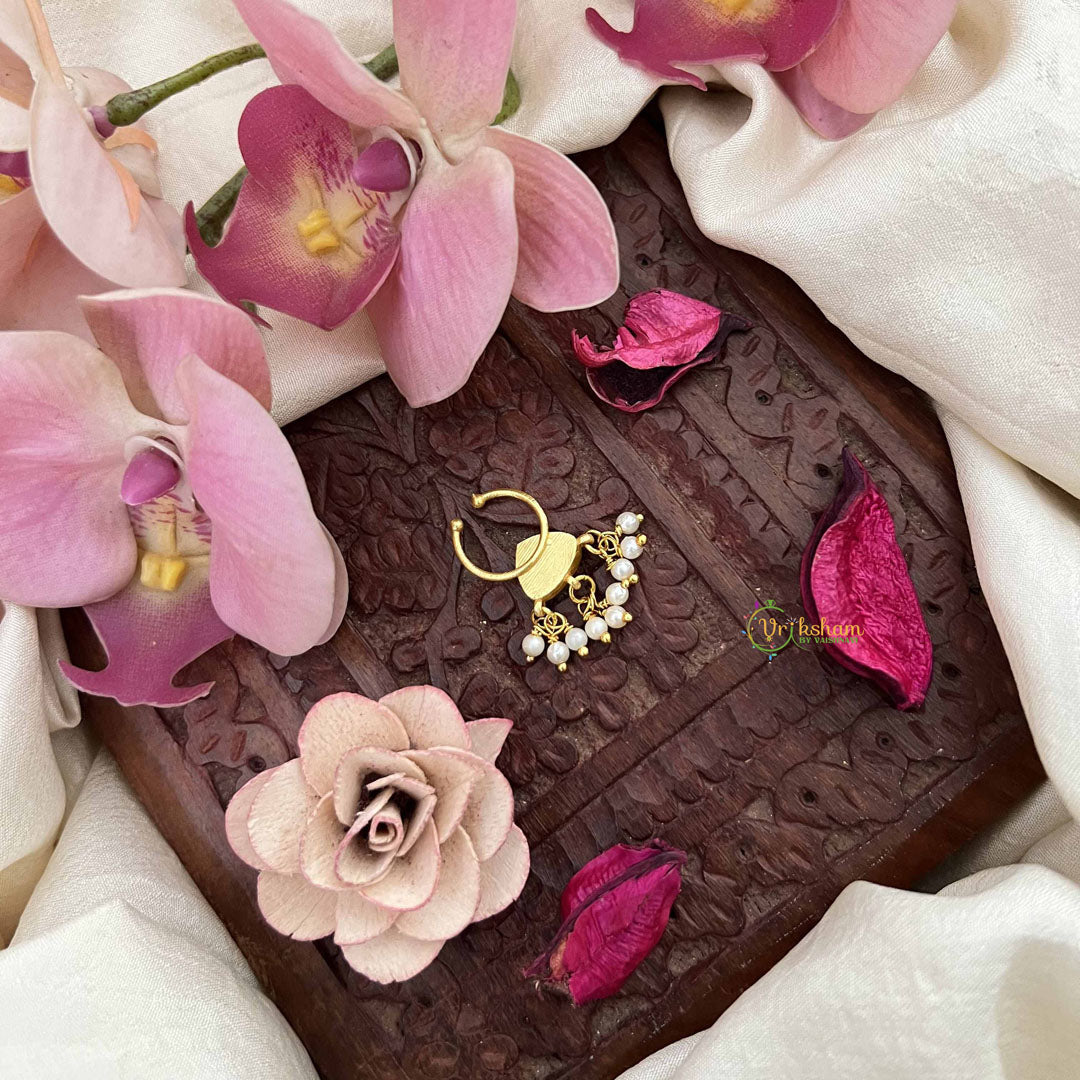 This pear drop style septum ring combines lustrous white pearls with intricate gold-toned Kundan Jadau craftsmanship. Its elegant design offers a delicate balance of classic beauty and refined artistry, perfect for adding a subtle yet sophisticated statement to your traditional look.