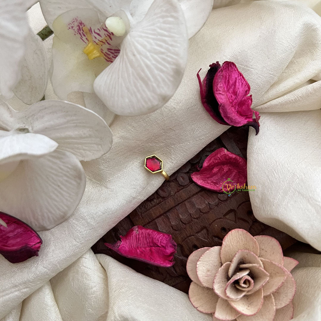 The Vriksham Hexagon Jadau Kundan Nath in red features a distinctive hexagonal design adorned with intricate Kundan craftsmanship. This sophisticated nose ring offers a modern geometric elegance while honoring traditional artistry, making it a striking accessory to elevate your ensemble with refined style.