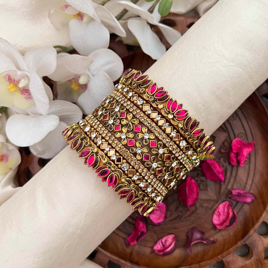 Transform your wrist with this stunning 20-piece collection of hot pink and crystal silk bangles, each adorned with delicate floral patterns and the distinctive lotus-inspired side kada design. This comprehensive set provides exceptional versatility, allowing you to create layered looks or wear individual pieces for understated elegance. The radiant hot pink shade exudes confidence and contemporary flair, while the crystalline embellishments sparkle with refined brilliance. The silk base ensures comfort during extended wear, making these bangles ideal for weddings, festivals, and celebrations. The intricate lotus motif on the side kada adds a spiritual dimension to the design, connecting you to traditional Indian artistry while maintaining a distinctly modern aesthetic. Perfect for those seeking bold color, exceptional craftsmanship, and the freedom to style with creativity.