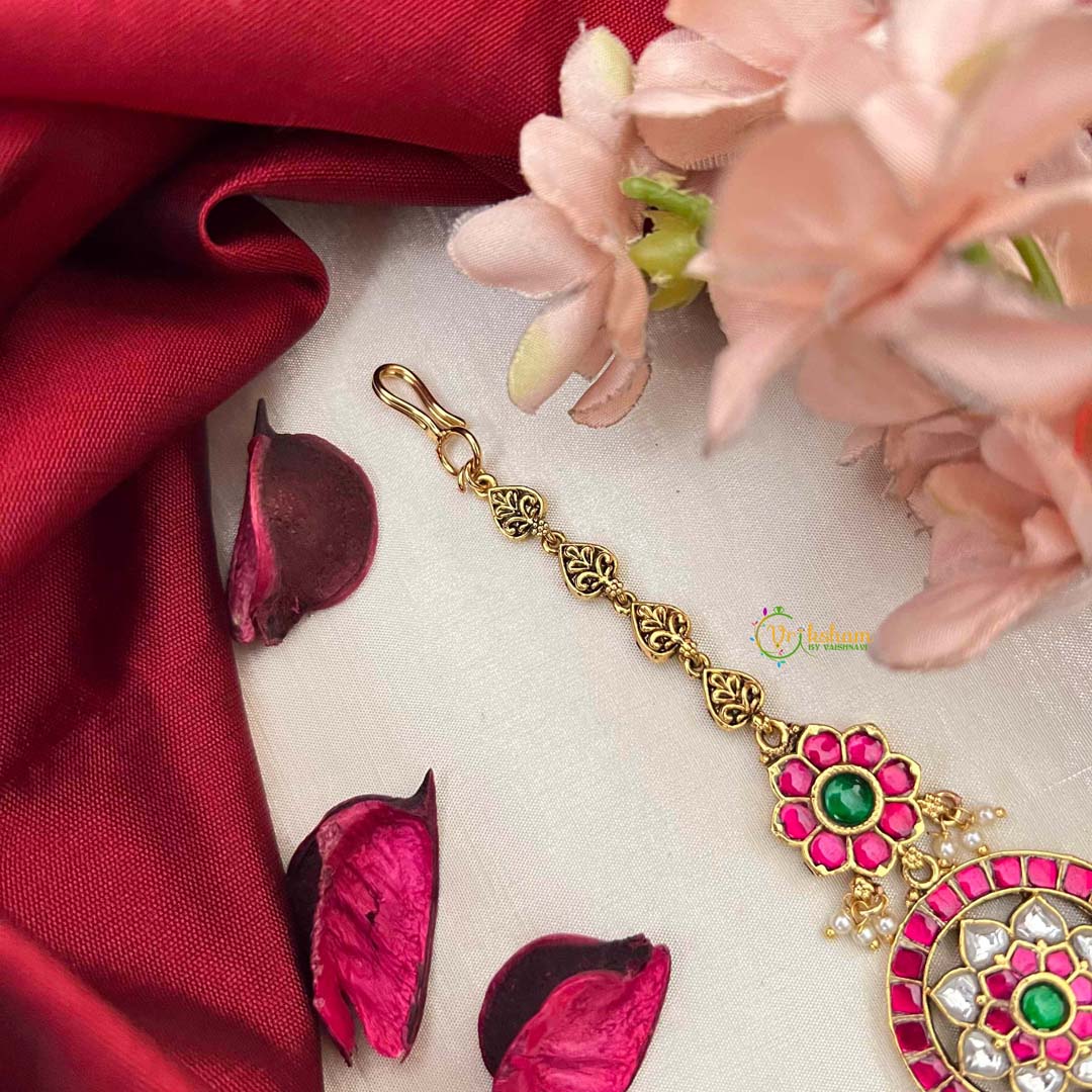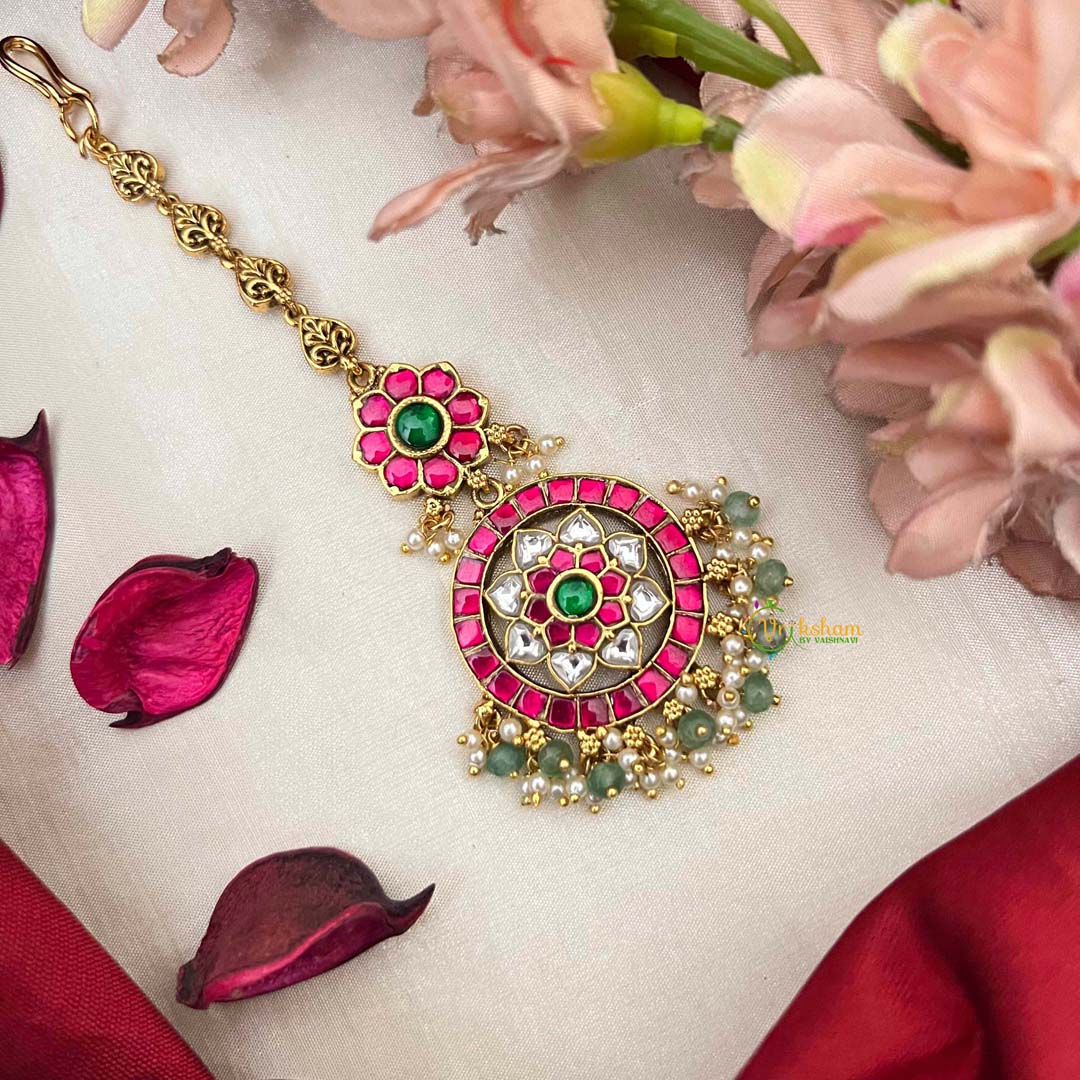 Celebrate your special day with this exquisite Indian bridal floral kundan jadau maang tikka, a botanical masterpiece of traditional artistry. The intricate floral design showcases exceptional kundan craftsmanship, adorned with vibrant red, lush green, and pristine white gemstones that create a stunning chromatic harmony. Delicate green bead accents enhance the piece's natural elegance, adding movement and grace. This sophisticated maang tikka embodies the essence of Indian bridal heritage, making it an indispensable accessory for brides who seek jewelry that honors ancestral traditions while radiating timeless beauty and cultural pride.