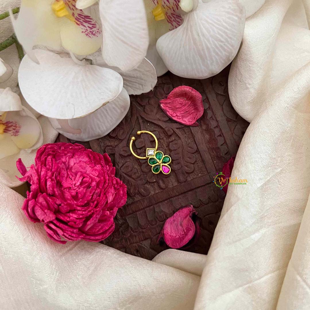 Embrace authentic Indian heritage with this ethnic-inspired kundan jadau septum ring, a celebration of traditional jewelry craftsmanship. Adorned with striking red, green, and white kundan stones meticulously set using the ancient jadau technique, this piece radiates cultural richness and timeless beauty. The sophisticated design honors centuries of artisanal tradition while making a graceful statement at your septum. Each detail reflects the precision and artistry of master craftsmen, creating a refined accessory that transcends trends. Perfect for those who cherish ethnic elegance and seek jewelry that tells a story of heritage and refinement.